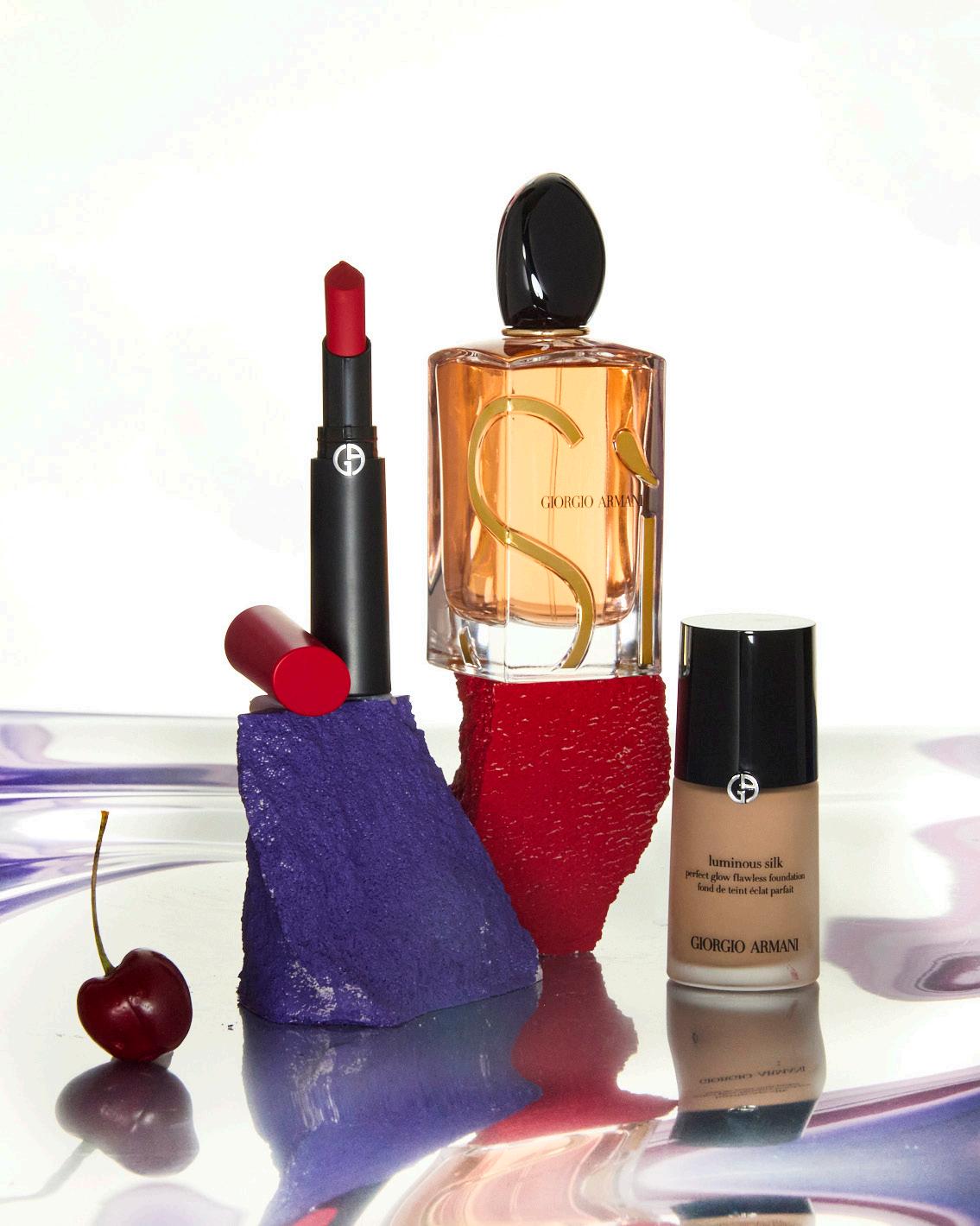 Lip Power Matte Lipstick in 400, $69, Sì Eau de Parfum Intense 100ml, $295, and Luminous Silk Foundation, $105.