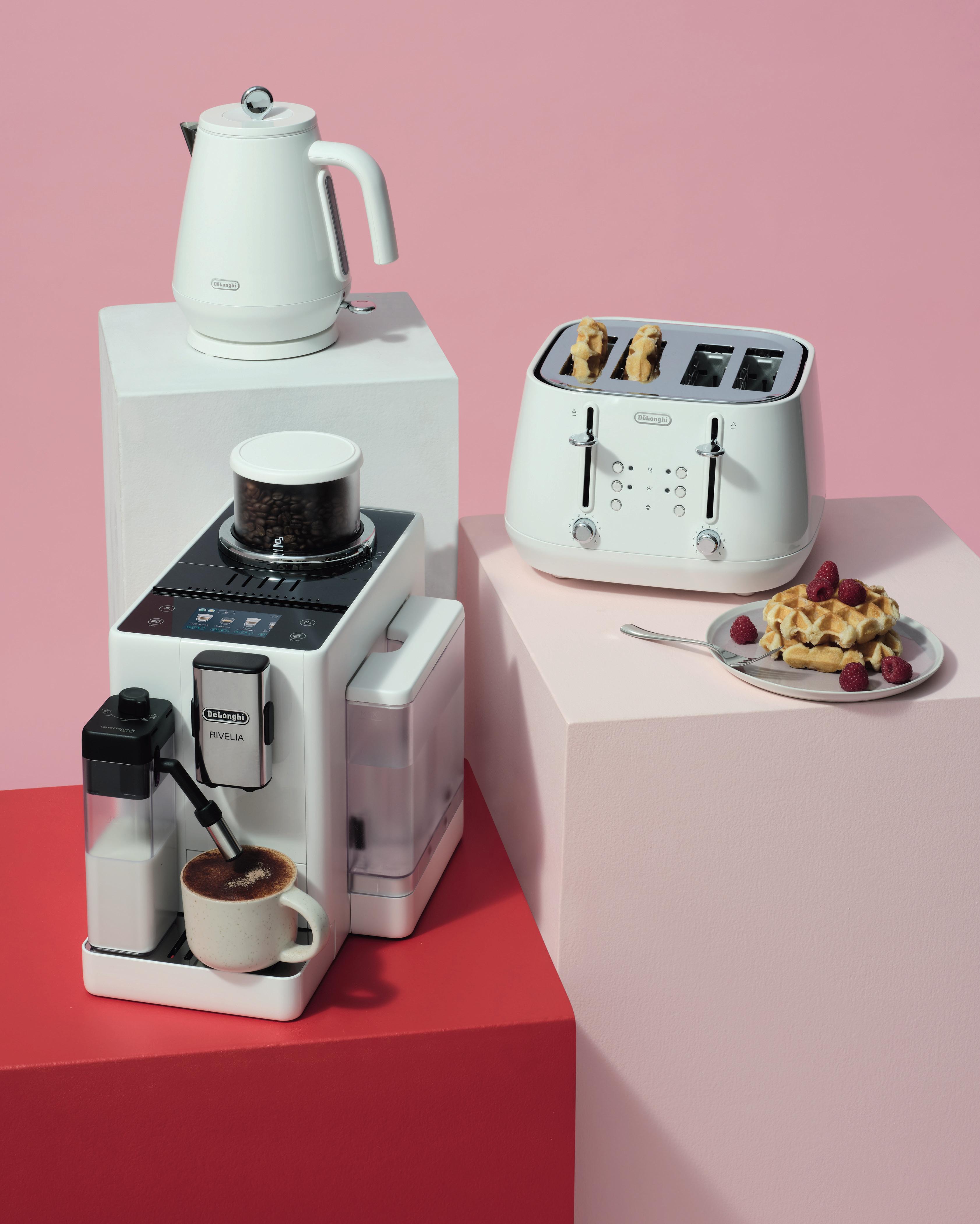 Clockwise from top left: DE’LONGHI ‘KBY2001W’ Eclettica 1.7L Kettle, $159, ‘CTY4003W’ Eclettica Four-Slice Toaster, $179, and ‘EXAM44055W’ Rivelia Automatic Coffee Machine, $1699. ROBERT WELCH ‘Malvern’ 56-Piece Cutlery Set, $499.95. ECOLOGY ‘Tide’ Side Plate 21cm, $14.95, and ‘Domus’ Mug 270ml, $59.95 for four