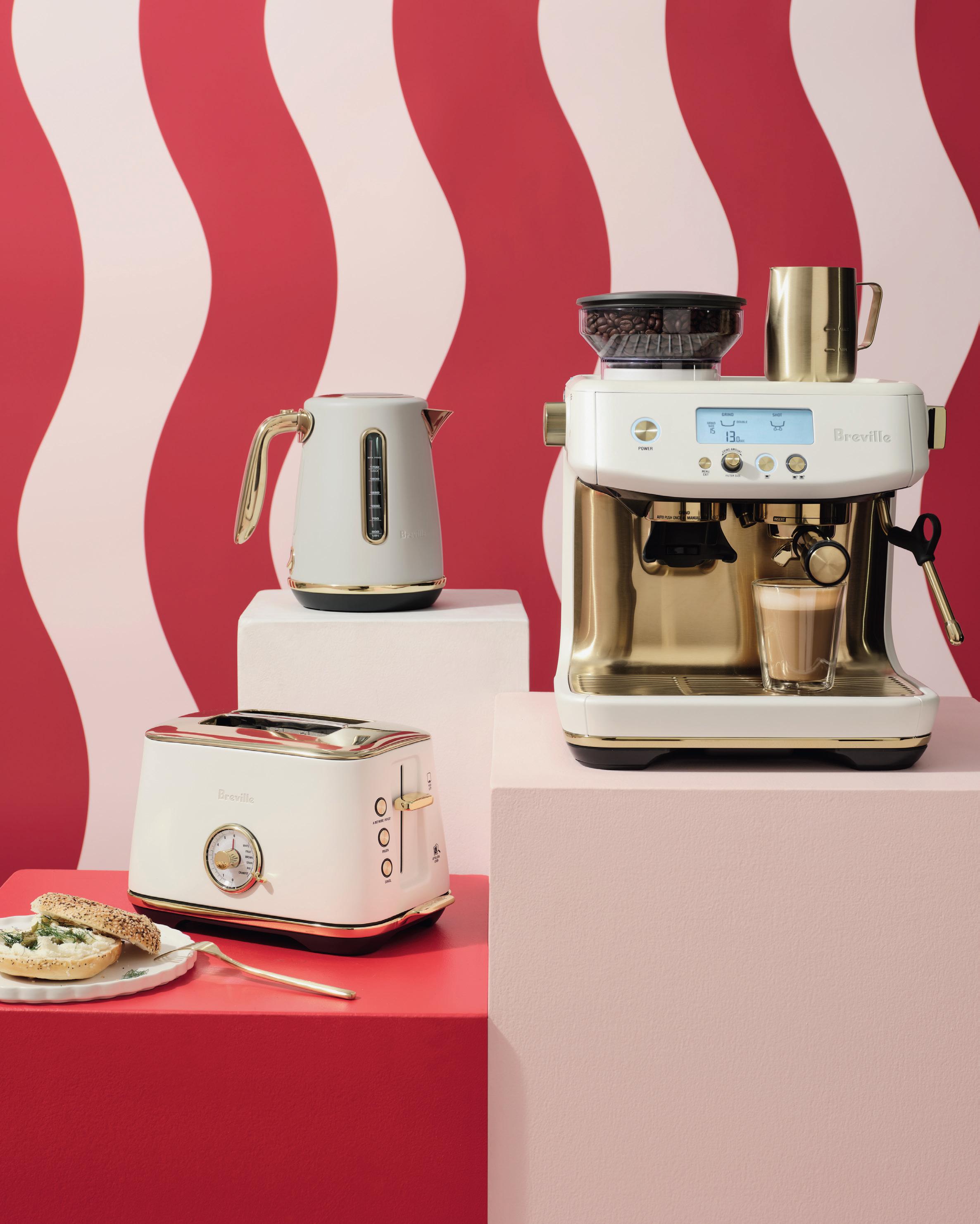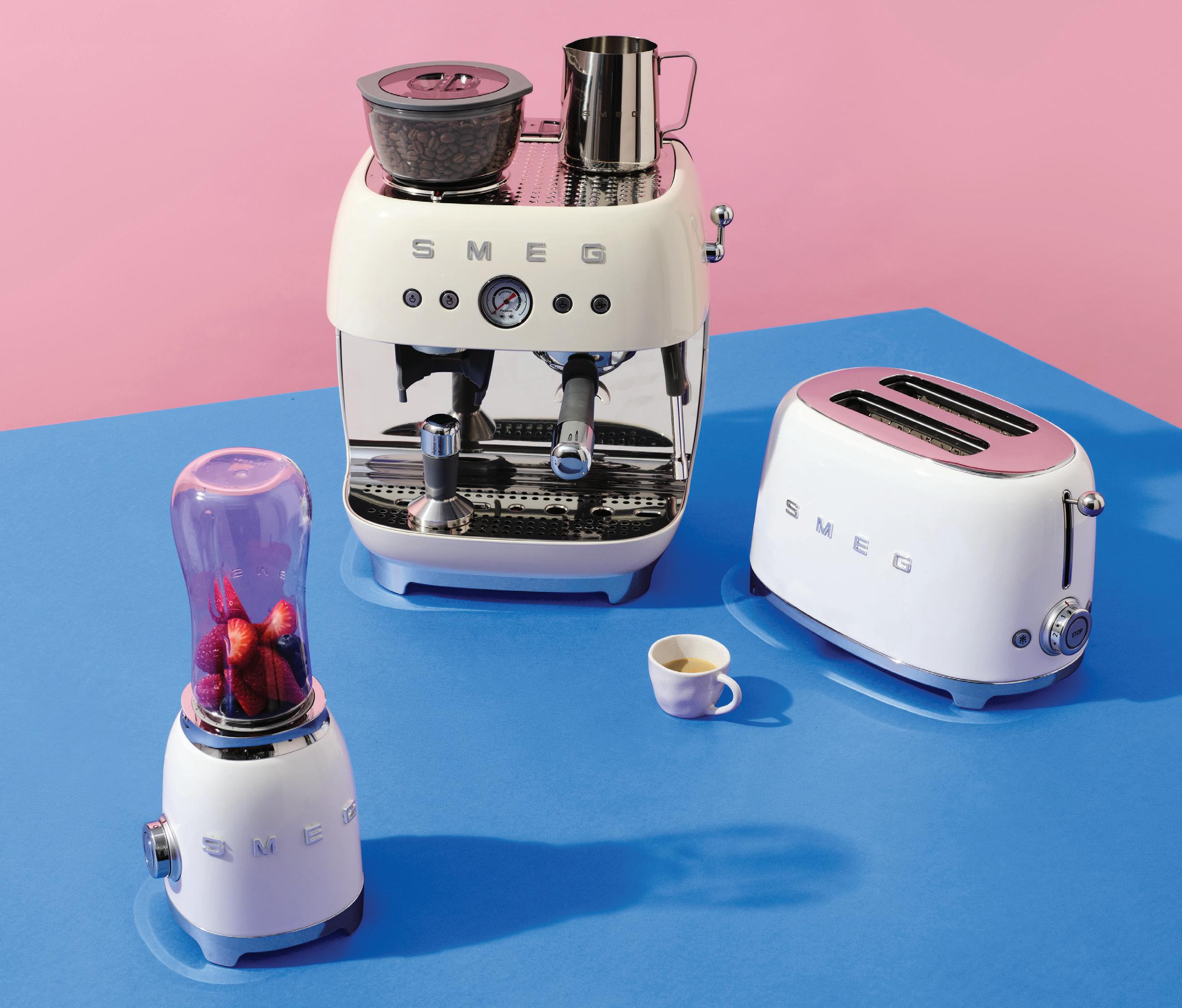 Clockwise from top: SMEG ‘EGF03WHAU’ Manual Coffee Machine, $1199, ‘TSF01WHAU’ Two-Slice Toaster, $249, and ‘PBF01WHAU’ Mini Blender, $199. ECOLOGY ‘Speckle’ Espresso Cup 60ml, $6.95.