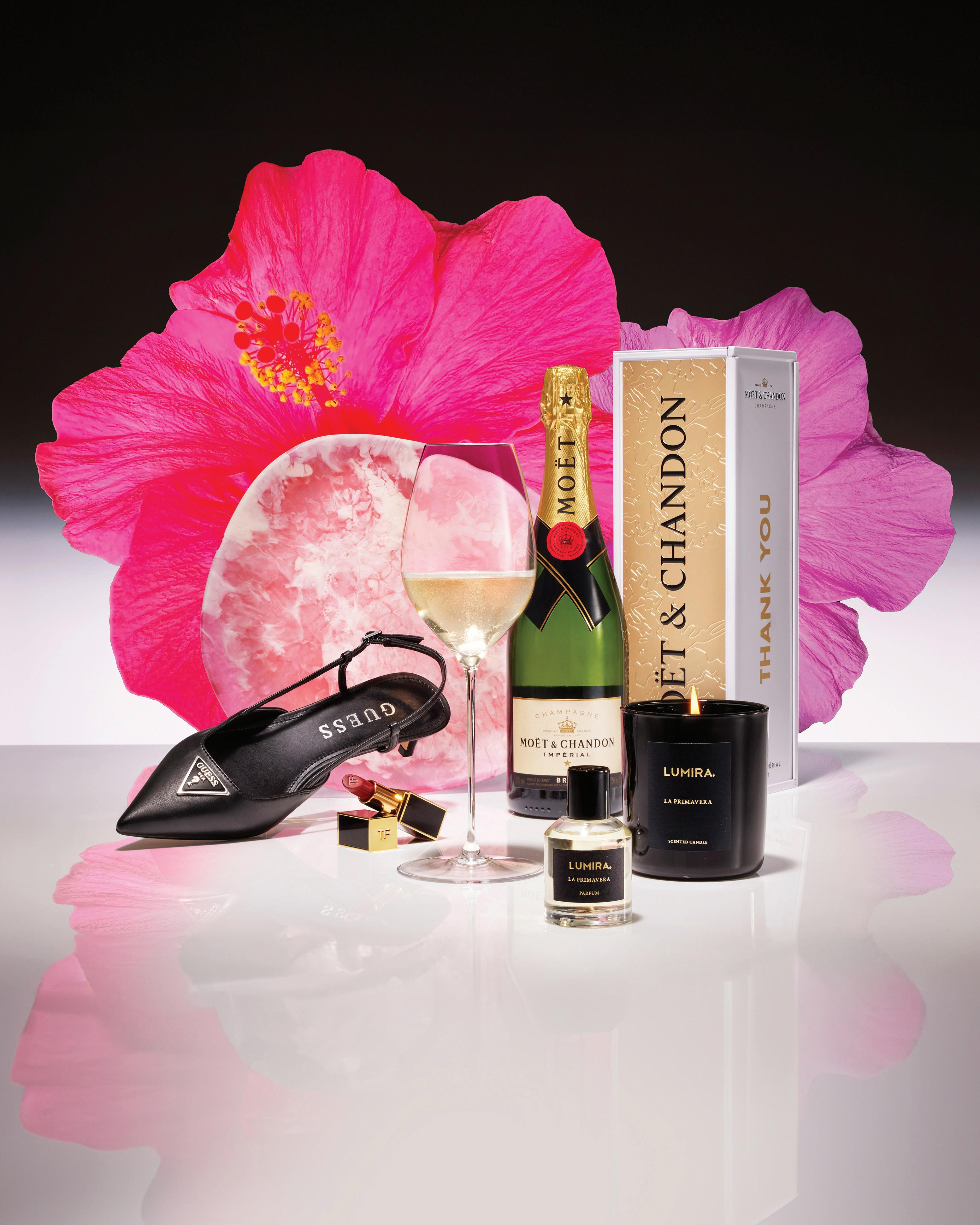 From left: GUESS ‘Jesson2’ slingbacks, $159.95. DINOSAUR DESIGNS ‘Pebble’ Plate in shell pink, $180. TOM FORD Lip Color in Impassioned, $86. RIEDEL ‘Superleggero’ Champagne Wine Glass, $75. MOËT & CHANDON Impérial Brut ‘Thank You’ Metal Tin 750ml, $99.95. LUMIRA La Primavera Eau de Parfum 50ml, $135, and Candle, $80.