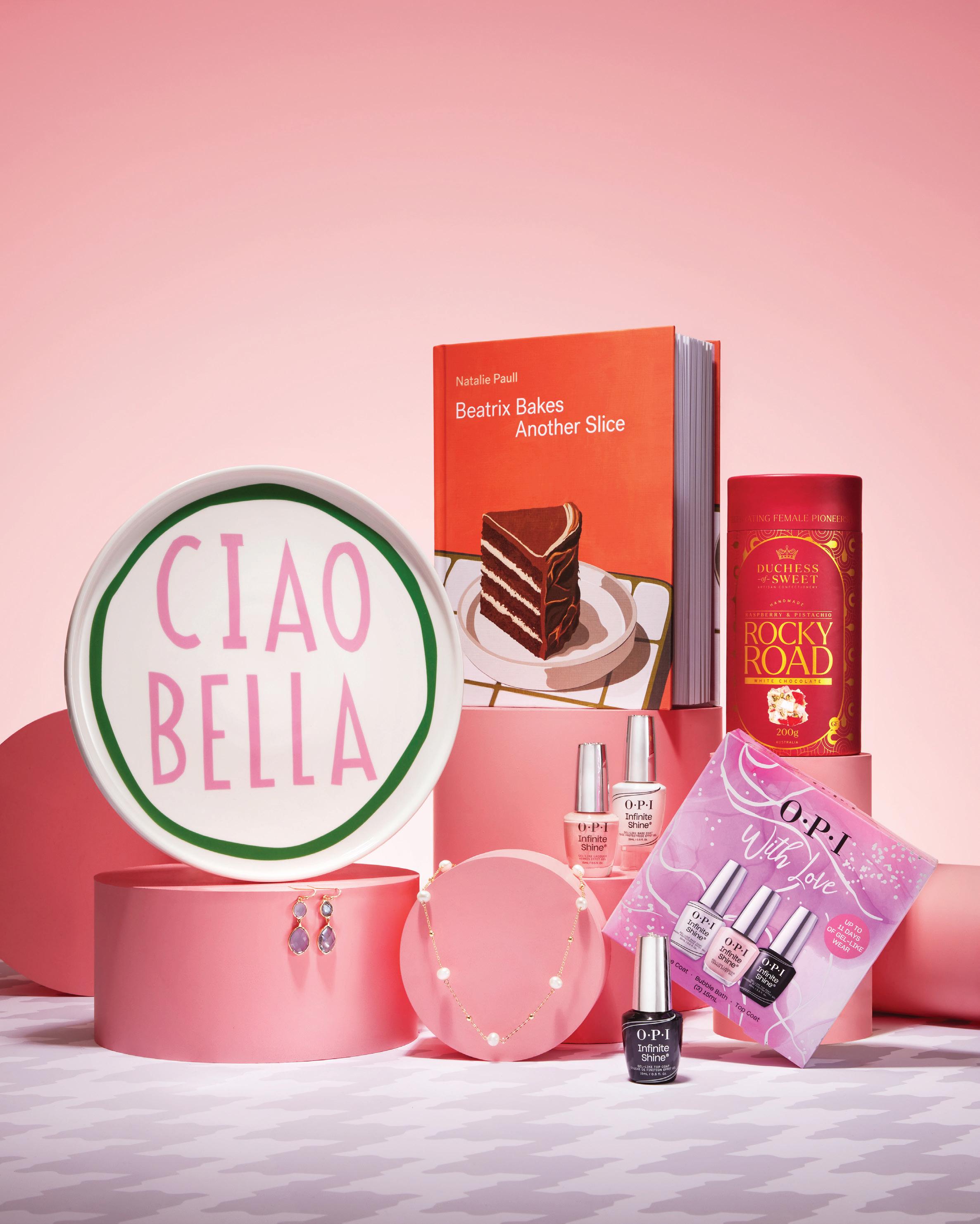 Clockwise from top left: IN THE ROUNDHOUSE ‘Ciao Bella’ Plate 25cm, $29. Beatrix Bakes: Another Slice by Natalie Paull, RRPµ $50 NOW $35. DUCHESS OF SWEET Raspberry & Pistachio White Chocolate Rocky Road 200g, $24.95. OPI Infinite Shine Trio Gift Set, $46.95. Includes: Infinite Shine Base Coat, Top Coat and Lacquer in Bubble Bath GREGORY LADNER Pearl link necklace, $39.95. BARCS Drop earrings, $49.95.