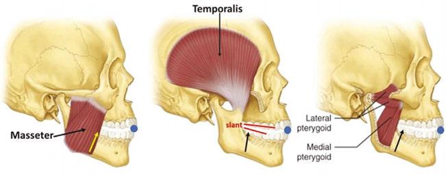 Figure 2: Medical illustration of three skulls, identifying the elevator muscles, showing their direction of closure with arrows. The blue balls represent anterior/incisal stabiizers. With no posterior resistance to the overpowering force of the elevators, the result is registration of slant.