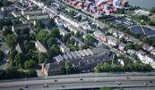 Die Reihenhäuser an der Kade sind einseitig in Richtung Fluss orientiert und an dieser Seite ebenfalls vollständig verglast. Die Rückseite dieser Reihenhäuser grenzt an die Parkgarage – das Haus ist also direkt mit dem Auto zu erreichen: es ist eine Neuinterpretation der Drive-In-Wohnung.