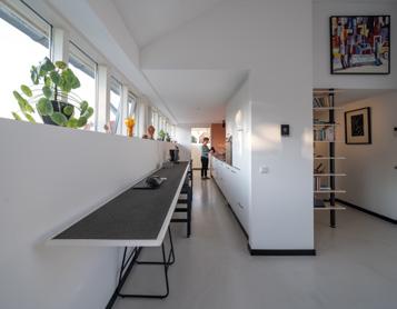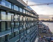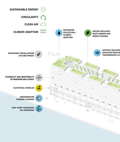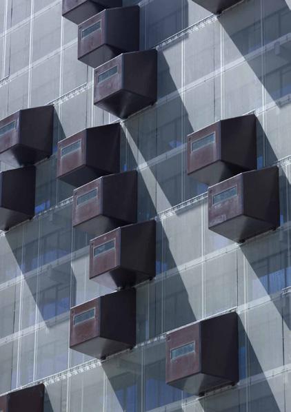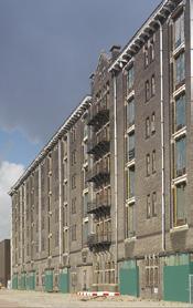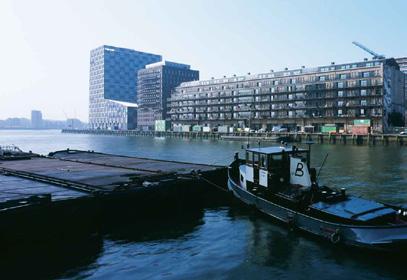 Kennzeichnend für das Projekt ist die 130 m lange Gebäudescheibe, die 50 m über die alte Elektrizitätszentrale hinausragt. In dieser Scheibe befinden sich die Büros und die WohnArbeitseinheiten. Erschlossen werden diese über einen Laubengang, dessen Fassade mit ein speziell für dieses Projekte entwickeltes Edelstahlgewebe bekleidet ist. Die Abstellräume sind nicht konventionell in den Keller verstaut, sondern „hängen“ am Laubengang –auffallende Objekte an der Fassade, jeweils gegenüber dem Eingang situiert. Die Westseite des Gebäudes ist dahingegen vollständig verglast – jede Wohnung hat so einen fantastischen Blick über den Fluss Nieuwe Maas. Um diese Aussicht und die Hafenatmosphäre optimal genießen zu können, ist die gläserne Fassade mit einem Harmonikasystem vollständig zu öffnen. Die Sonnenterrasse wird in der Wohnung kreiert.