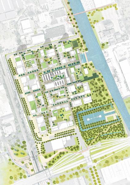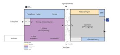 Der Neubau umfasst 55.000 m2 an Programmflächen, in 7000 m2 hiervon befinden sich Büros. In den restlichen m2 verteilen sich 156 flexibel zu gestaltende Wohnungen mit gewerblichen Anteilen und zwanzig 3,5 geschossige Reihenhäuser an der Kade. Außerdem gibt es einen 2000 m2 großen Supermarkt, einen 600 m2 großen Sportsaal, eine Parkgarage für 400 Autos und ein halböffentliches Spiel-, und Freizeitdeck von 3000 m2. Eine Sonnenterrasse, eine Tribüne und ein Hort mit Spielplatz komplettieren letzteres.