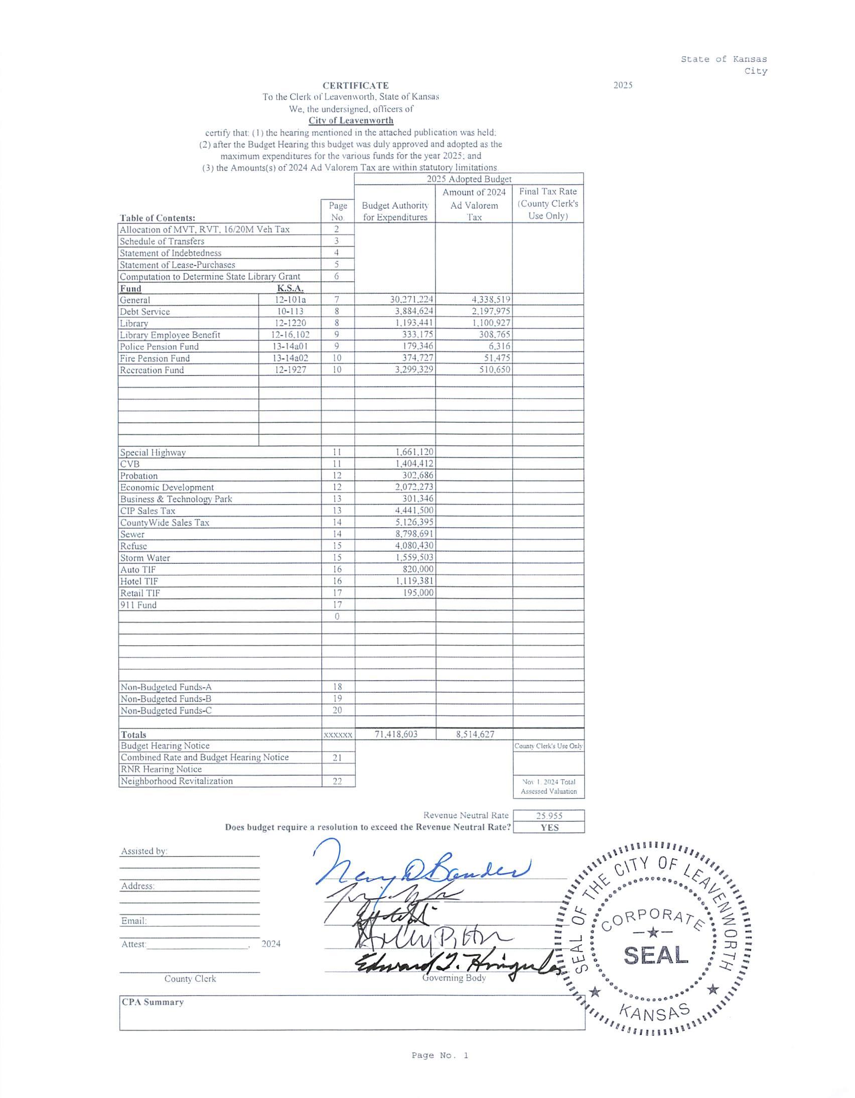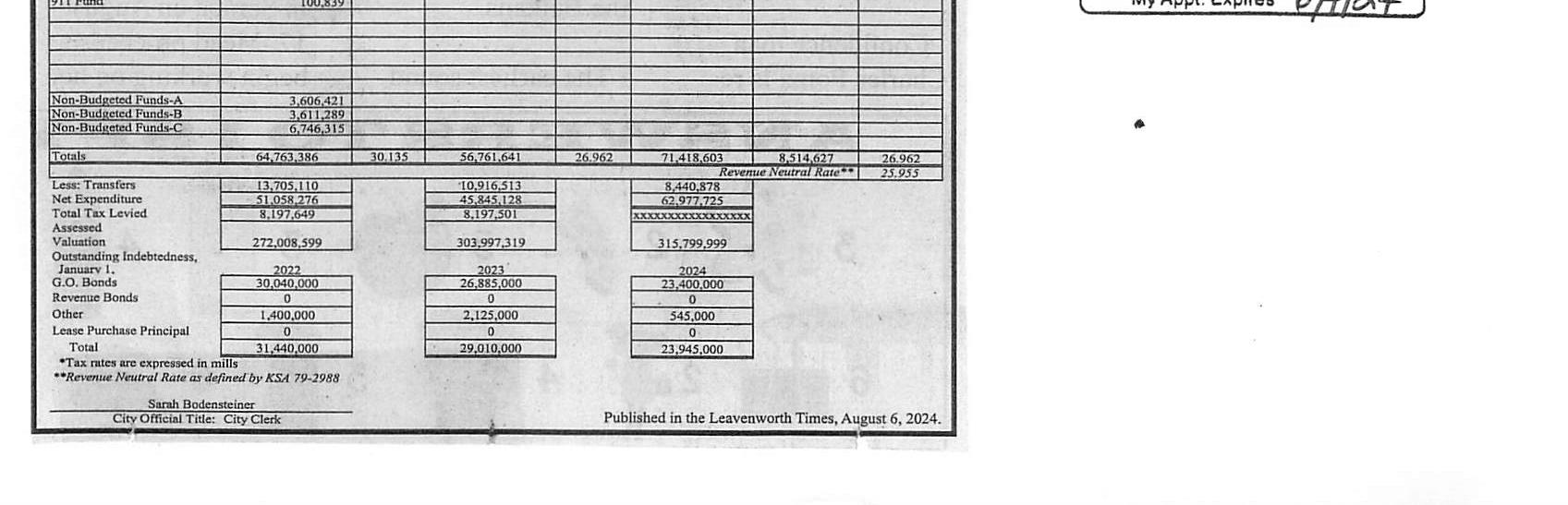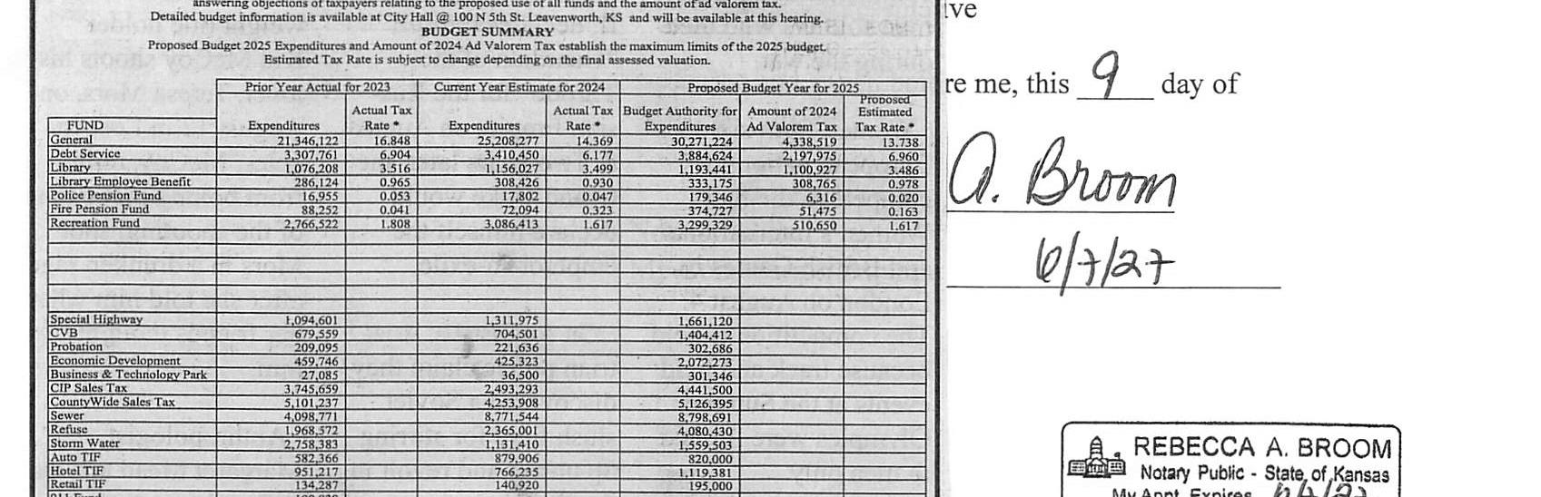 Thegoverningbodyof Cityof Leavenworth willmeetonAugust27,2024at6:00PMatCityHall@100N5thSt.Leavenworth,KS forthepurposeofhearingand answeringobjectionsoftaxpayersrelatingtotheproposeduseofallfundsandtheamountofadvaloremtax.