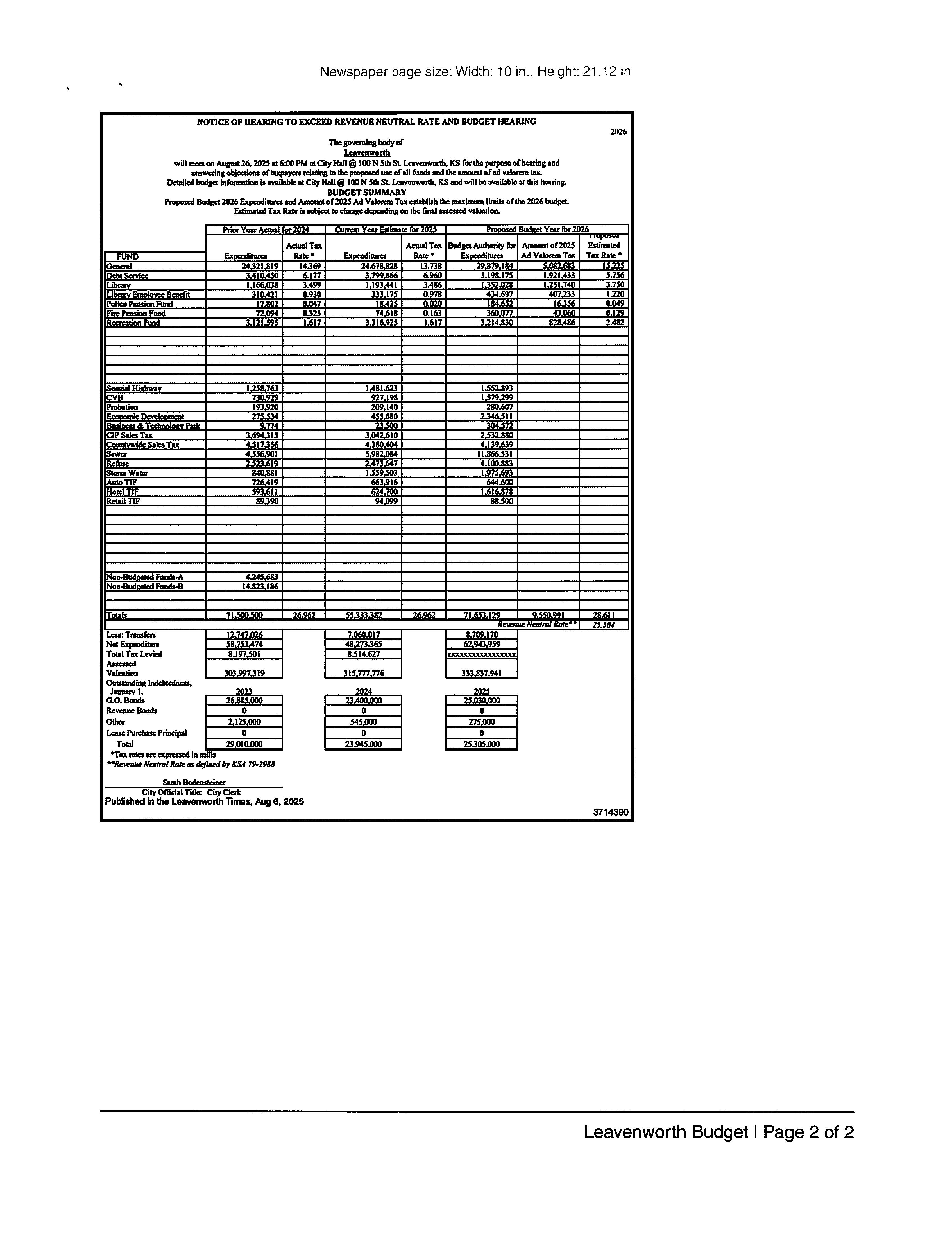 Thegoverningbodyof Leavenworth willmeetonAugust26,2025at6:00PMatCityHall@100N5thSt.Leavenworth,KSforthepurposeofhearingand answeringobjectionsoftaxpayersrelatingtotheproposeduseofallfundsandtheamountofadvaloremtax.