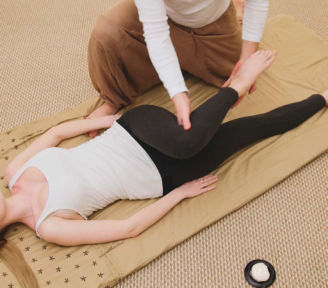 The Thai Bodywork Practitioner presses and kneads the muscles with their hands, feet, and forearms, synchronized with the breath, and fluently moves and twists your body into various stretches and yoga postures. The bodywork sessions are given on a memory foam mat in four positions: lying supine, side-lying, lying prone, and seated.