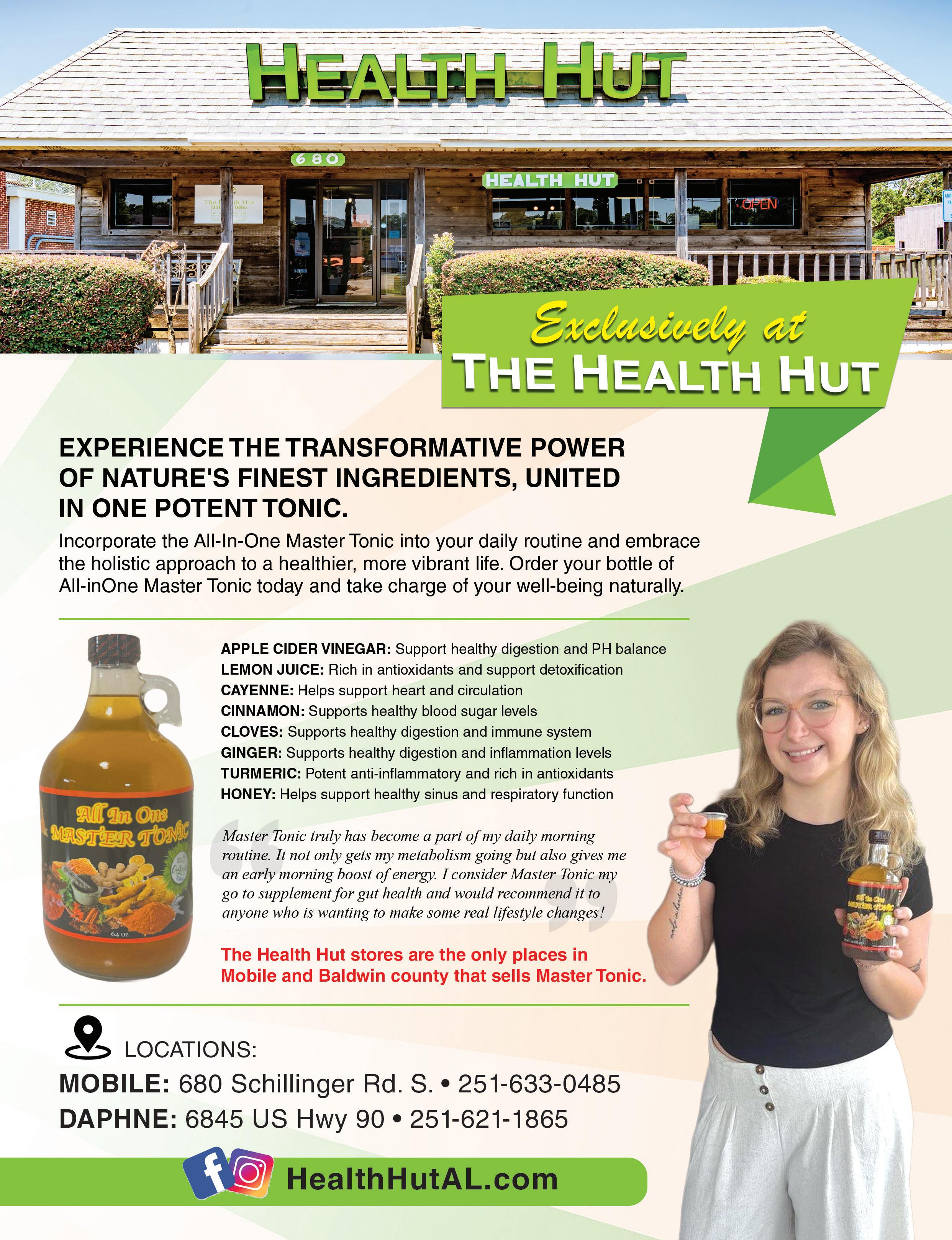 The Health Hut locations: 680 Schillinger Rd. S., Mobile. Call 251-6330485 and 6845 U.S. Hwy. 90, Daphne. Call 251-621-1865. For more information visit HealthHutAL.com. See ad, back cover.