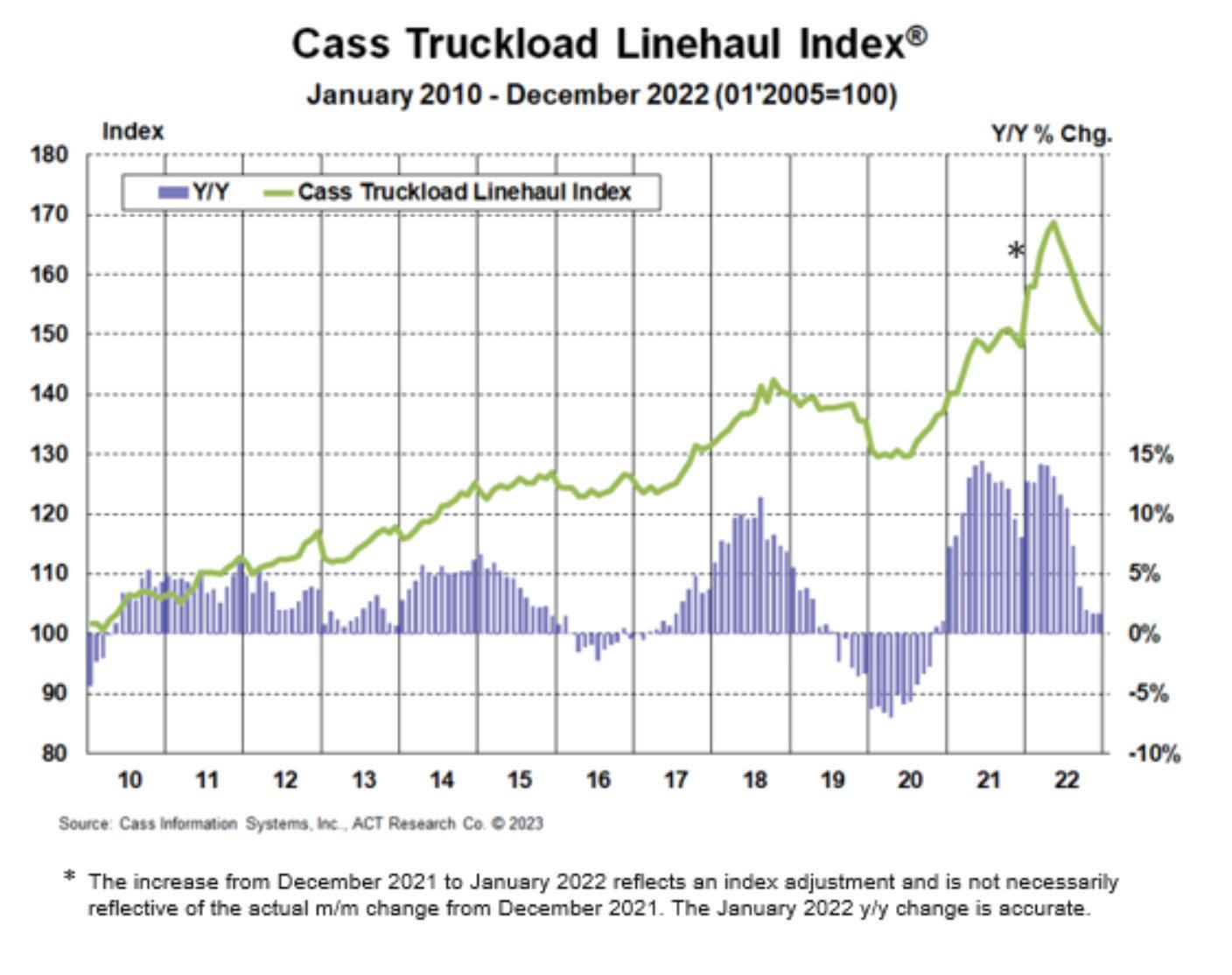 This index includes changes in fuel, modal mix, intramodal mix, and accessorial charges, so is a bit more volatile than the cleaner Cass Truckload Linehaul Index®.