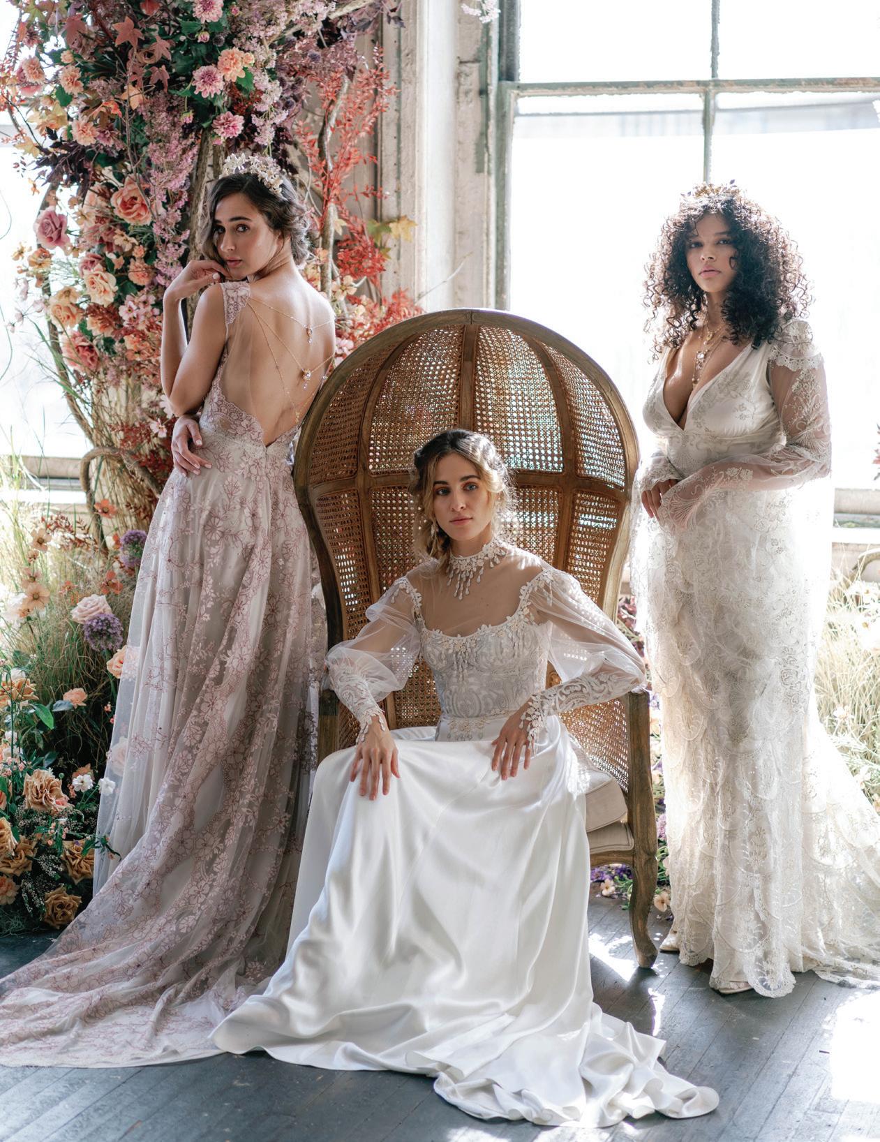 Bridal gowns by Haley Paige offers modern and playful design, while boho brides seek vintage vibes that have an Old World brought to life with flowing fabrics and classic silhouettes.