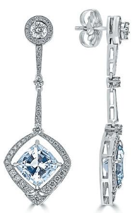 These Juleve aquamarine & round diamond drop Evolving Earrings feature stunning 4.05 carat total weight cushion cut aquamarines & 1.46 carat total weight round diamonds. These beautiful earrings can be worn as diamond studs, diamond studs with the earring jackets, or all 3 earring components together! $9,420. Available at Gold & Diamond Source, www.goldanddiamond.com.