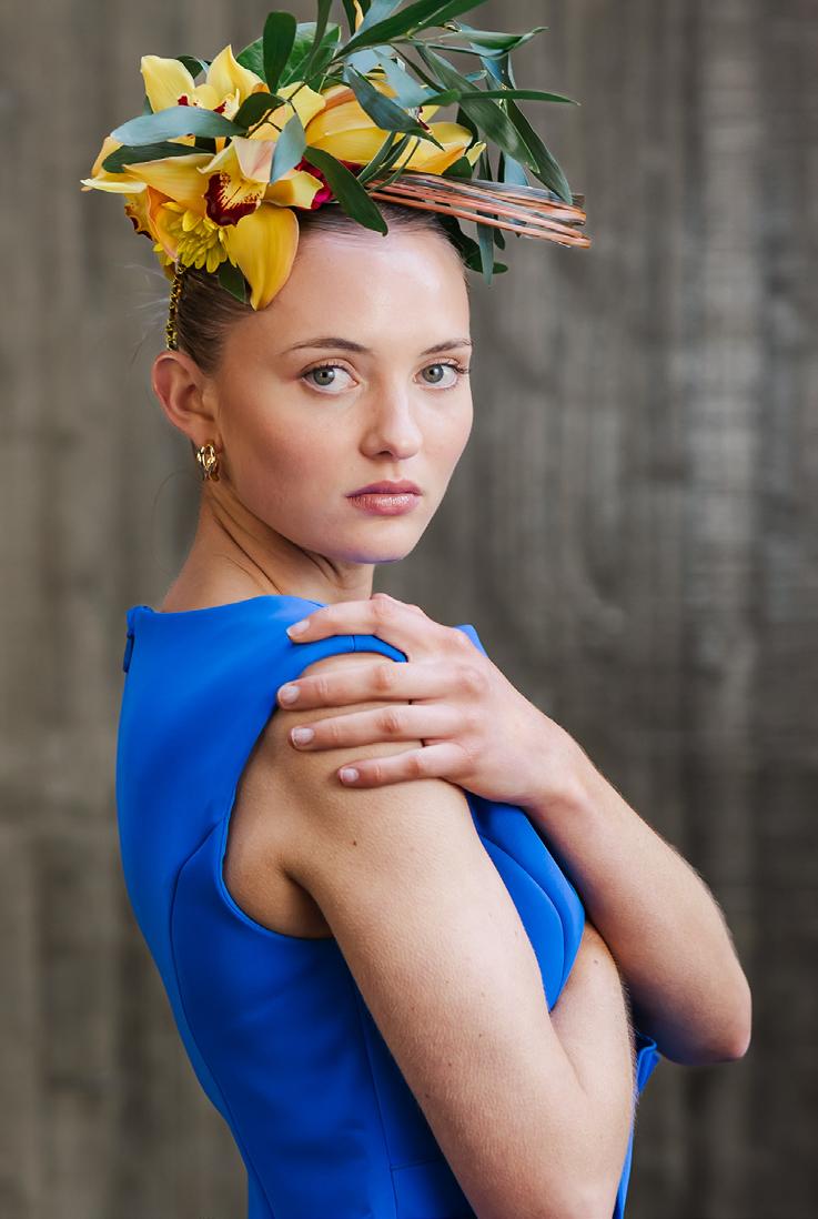 Every look begins with the headdress. “I work my way down from there. It is far easier to match an outfit to a hat than the other way around,” she advises. Gemma will sketch her design idea and take it to her dressmaker Amy, of Love in Every Stitch, who she began working with just a few seasons ago. “I love building the concept and having design input. Amy is wonderfully patient and capable so we nut it all out together and then she works her magic,” she explains. “I didn’t think a bespoke design would be an option when I started out, and while there is more time and e ort required, the overall cost is comparable and you get to create your own unique outfit, tailored to a high standard.”