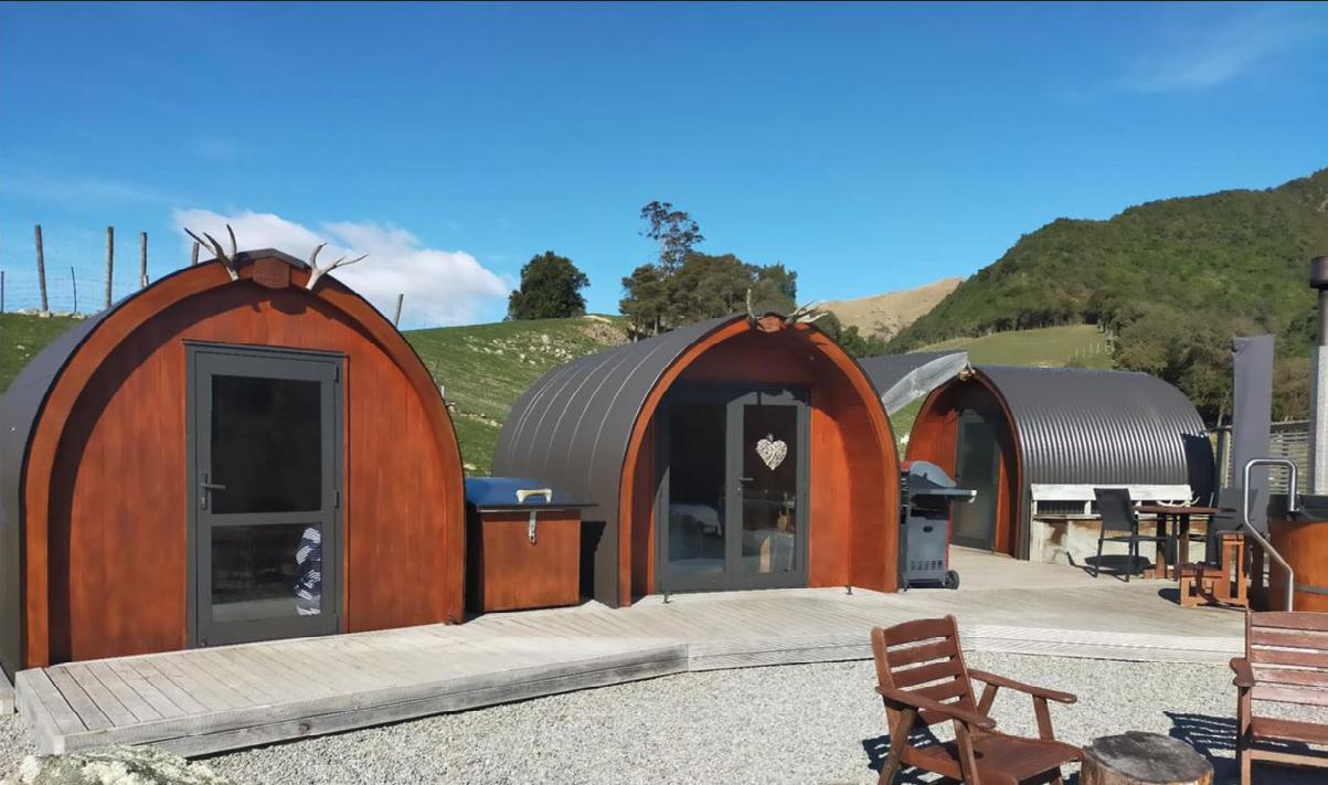 The Mt Nimrod Pod campsite o ers stunning views over native bush, farmland, and distant mountains. Unwind in a steaming wood-fired hot tub beneath a starlit sky, toast marshmallows by the fire, and wake to birdsong. Featuring three insulated, double-glazed pod cabins (bedroom, lounge, and half bath), the site includes an outdoor kitchen, river-fed hot tub, and cosy fire pit — perfect for two guests seeking relaxation and rejuvenation.