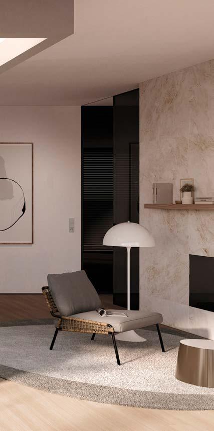 At the heart of the space, a statement fireplace anchors the living area, creating a focal point that enhances both the warmth and architectural depth of the penthouse. Surrounding it, the residence unfolds through a carefully curated selection of high-quality materials, each chosen for its durability, aesthetic integrity, and tactile appeal. The penthouse features self-leveling concrete floors and walls, forming a continuous and monolithic surface that enhances spatial fluidity.