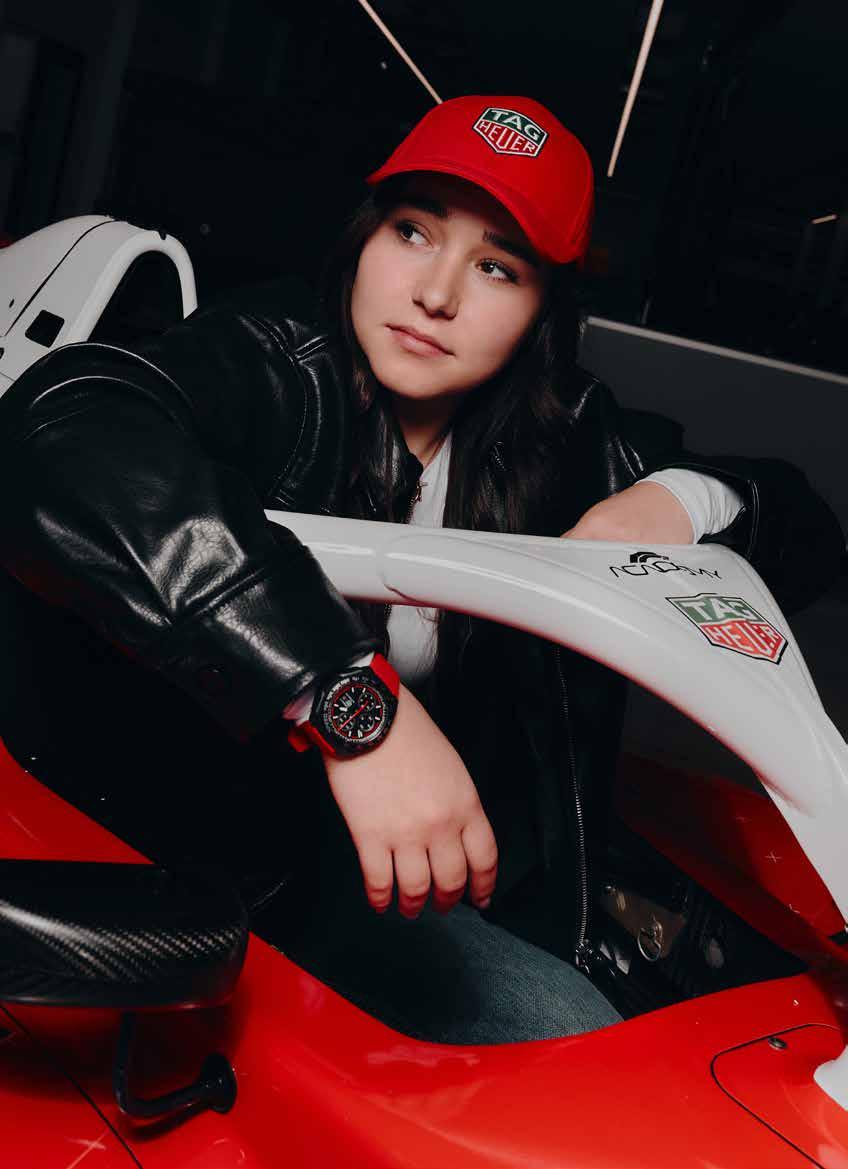 Il y a plusieurs personnes qui m'inspirent. Ayrton Senna a toujours été une idole – son talent brut, sa technique, sa détermination, l’émotion qu’il mettait dans sa conduite, et la façon dont il repoussait les limites, c’était incroyable. C’est une légende absolue du sport, et on ressent encore aujourd’hui son empreinte dans le monde de la course. Si je devais citer un pilote actuel, ce serait Max Verstappen. Sa constance, sa concentration, et cette façon presque chirurgicale de piloter, c’est impressionnant. Il est incroyablement talentueux et son humour très sec me fait vraiment rire. Donc quand j’ai visité la boutique TAG Heuer à