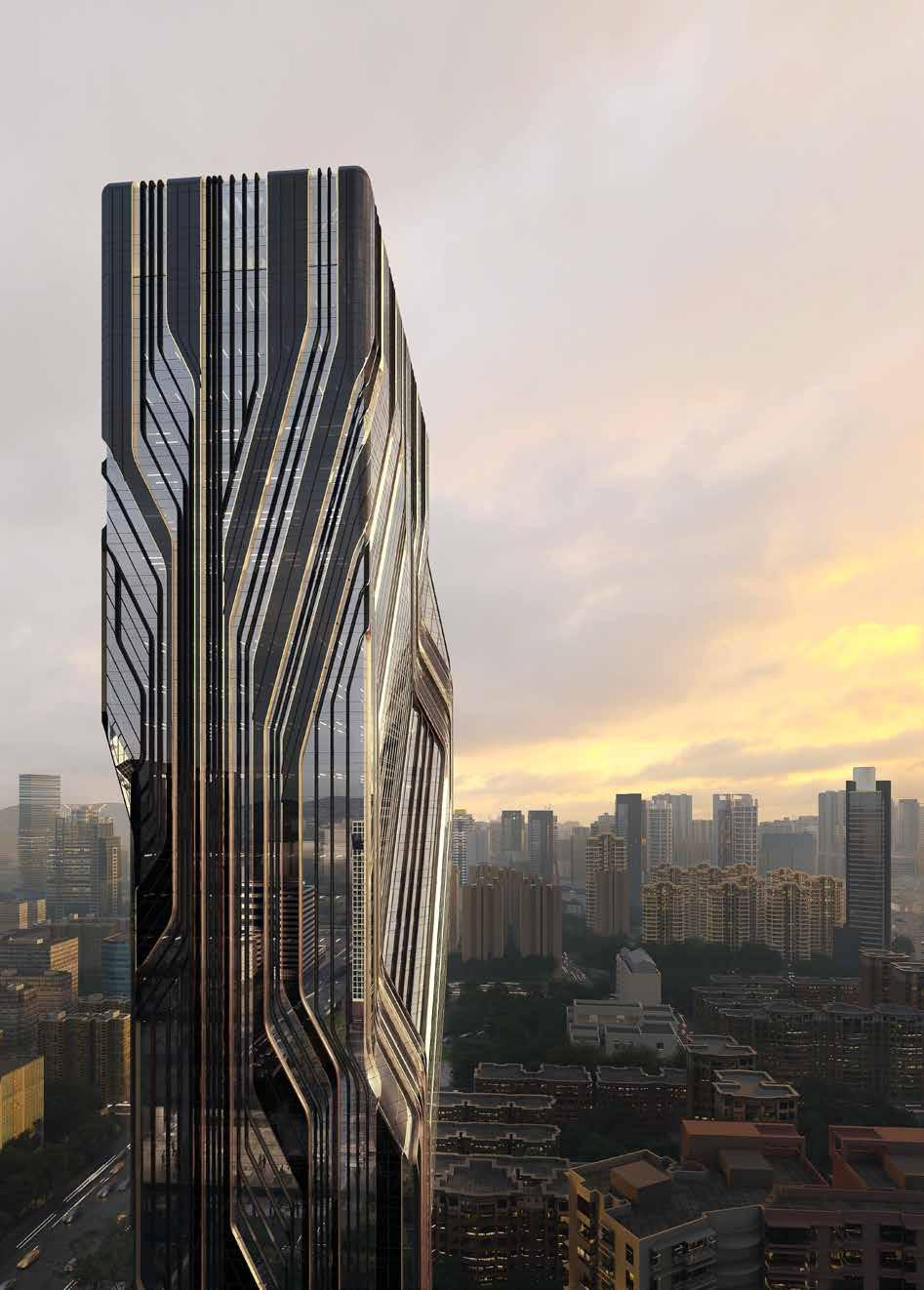 À gauche : L'Institut de technologie financière de Shenzhen s'élève à 199 mètres dans le ciel de la métropole chinoise, se distinguant par sa forme sculpturale unique. Ce ne sera pas le plus haut gratte-ciel de la ville, mais certainement l'un des plus innovants.