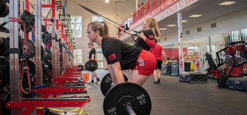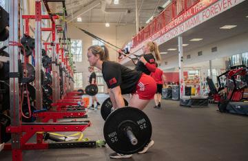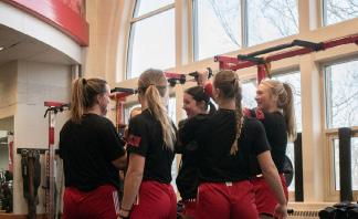 Center with a handful of teammates and a strength coach. The ladies continually rotate through their exercises and ask their coach for pointers on how to get the most out of their exercises. Lifting sessions typically don’t take as long during the season, so there’s a break before practice at the field later in the afternoon.