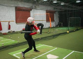 Down at the softball field, Murphy attends batting practice, where she takes turns with a teammate between batting and loading the pitching machine. During batting practice, team-