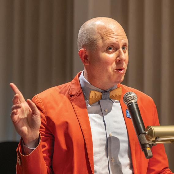 < THE FACULTY LEADER OF THE YEAR was presented to Jordan Fenton, Associate Professor of Art History, for his unwavering support of the museum and his groundbreaking work in African art history. Fenton has been instrumental in the success of the Art & Exchange exhibition and facilitated the acquisition of three Nigerian masquerades for the museum's collection.