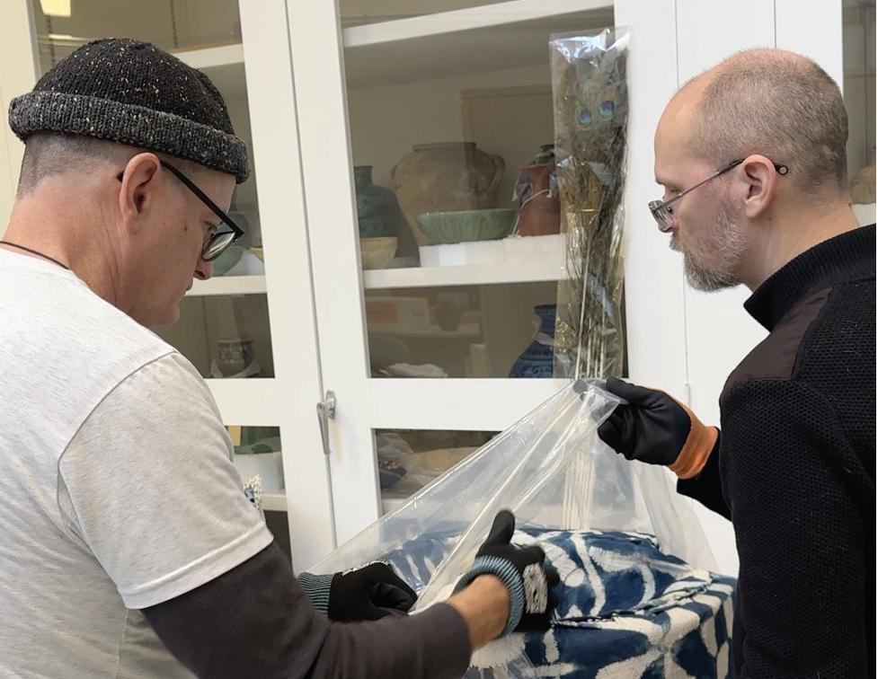 IMAGES TOP: Dr. Jordan Fenton at NOMA assisting in dressing and preparing the Idem Nkanda Ensemble. AT LEFT: David Dotson and Assistant Preparator, Billy Simms preparing the ensemble to be shipped to NOMA. ABOVE RIGHT: On display at the New Orleans Museum of Art. Chief Ekpenyong Bassey Nsa (Nigerian, b. 1973) Idem Nkanda Ensemble from the Ekpe Society, 2022; Ukara cloth (dyed with indigo), foam support, thread, yarn, mirror, sequin, rubber cement, and peacock feathers; Art Museum commission through the Orpha Webster Art Fund with support of the Provost’s Office and the College of Creative Arts at Miami University, Ralph and Barbara Drake Bresler, and William Brenner. 2022.16.