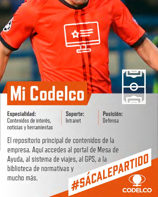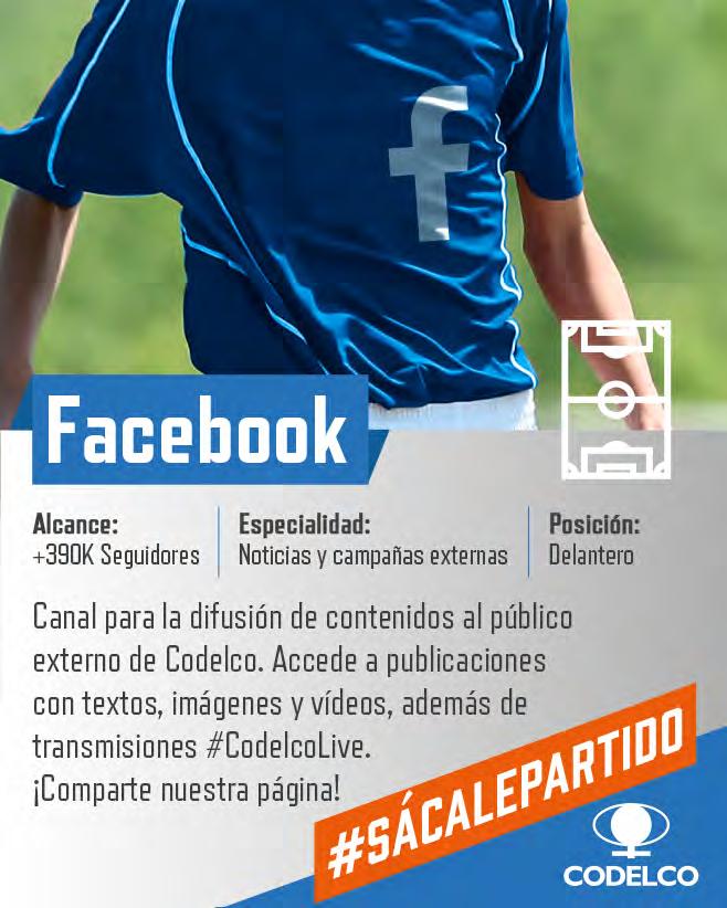 h ps://www.codelco.com/ h ps://mi.codelco.cl/ h ps://cl.linkedin.com/company/codelco h ps://es-la.facebook.com/CODELCO/ h ps://www.instagram.com/codelco_chile/ h ps://www.youtube.com/user/ChileCodelco h ps://twi er.com/CodelcoChile ¡BÚSCANOS! VOLVER A LA CANCHA