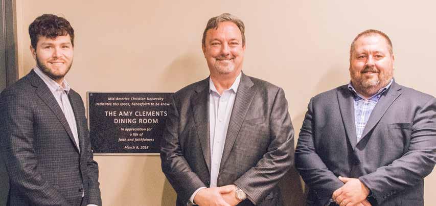 ON MARCH 6, during the annual spring visit of the MACU Board of Trustees, MACU named its two private dining areas in honor of Mike Clements’ late wife Amy Clements and Paul Odom. Known now as the Clements and Odom Dining Rooms, respectively, University Advancement Vice President Steve Seaton called the two men “wonderful friends of Mid-America Christian University.”