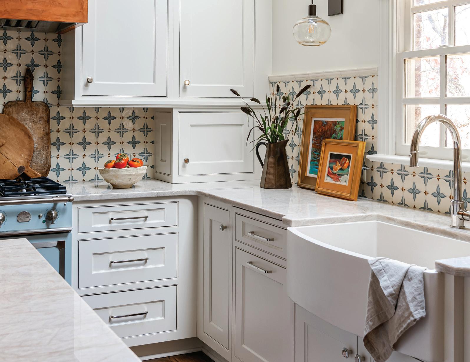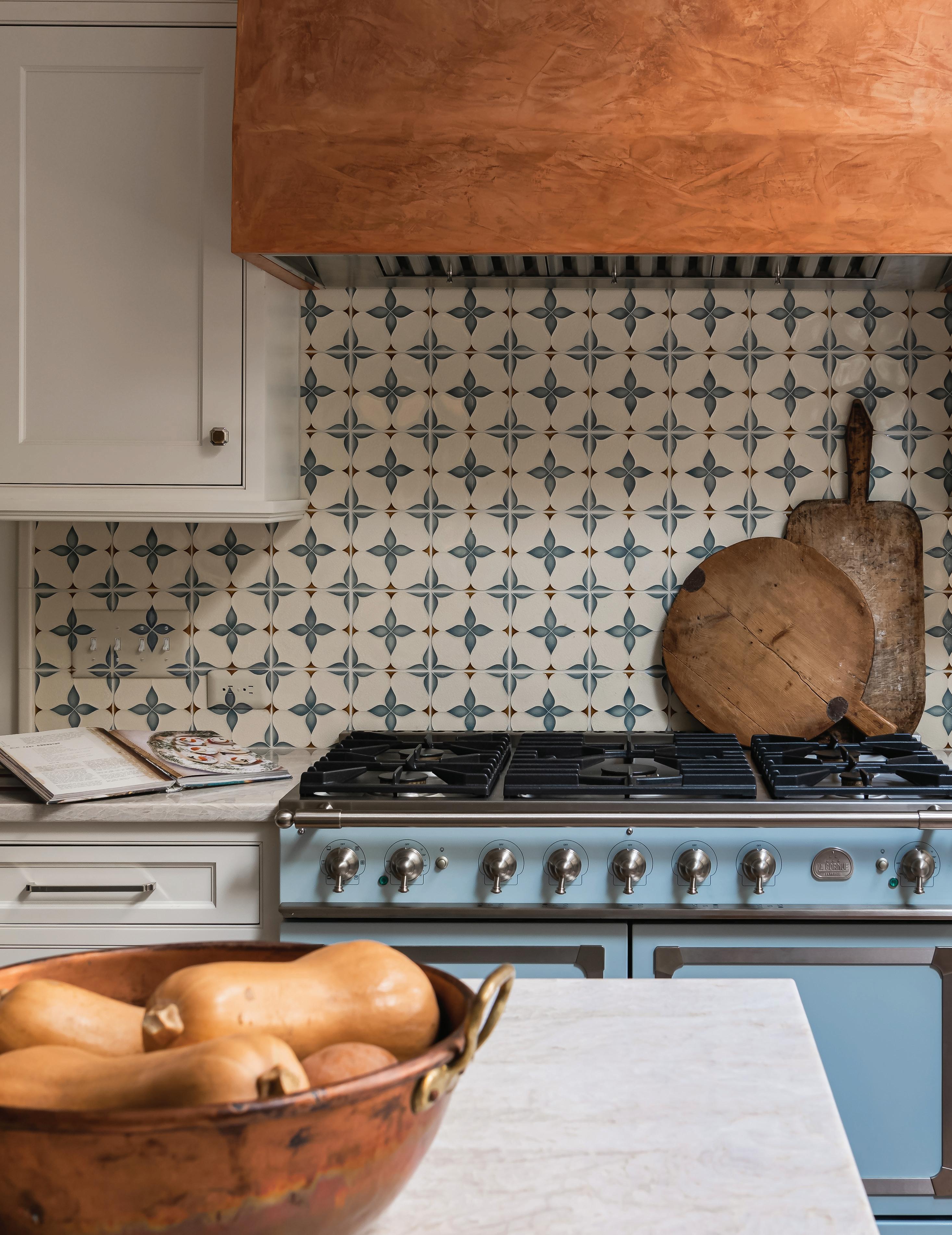 ON LEFT AND ABOVE: This kitchen embodies the warmth and rustic charm of a French country aesthetic. A La Cornue CornuFé series stove serves as a luxurious focal point for culinary creation, while the vent hood is artfully finished with Venetian plaster for an elegant, textured look. The bespoke cabinetry and the fitted reclaimed doors leading into the dining room showcase the beauty of natural wood and traditional craftsmanship. Muted blue cabinetry brings a subtle pop of color that ties in with the rest of the house. The quartzite countertops add a luxurious touch, their veining complementing the kitchen's neutral color palette. The space is thoughtfully accented with antique-style hardware and a mix of open and closed storage, harmonizing modern functionality with timeless design elements. The intricate tile work and the use of robust materials create an inviting atmosphere that is both sophisticated and comfortable, reflecting the soul of the French countryside.