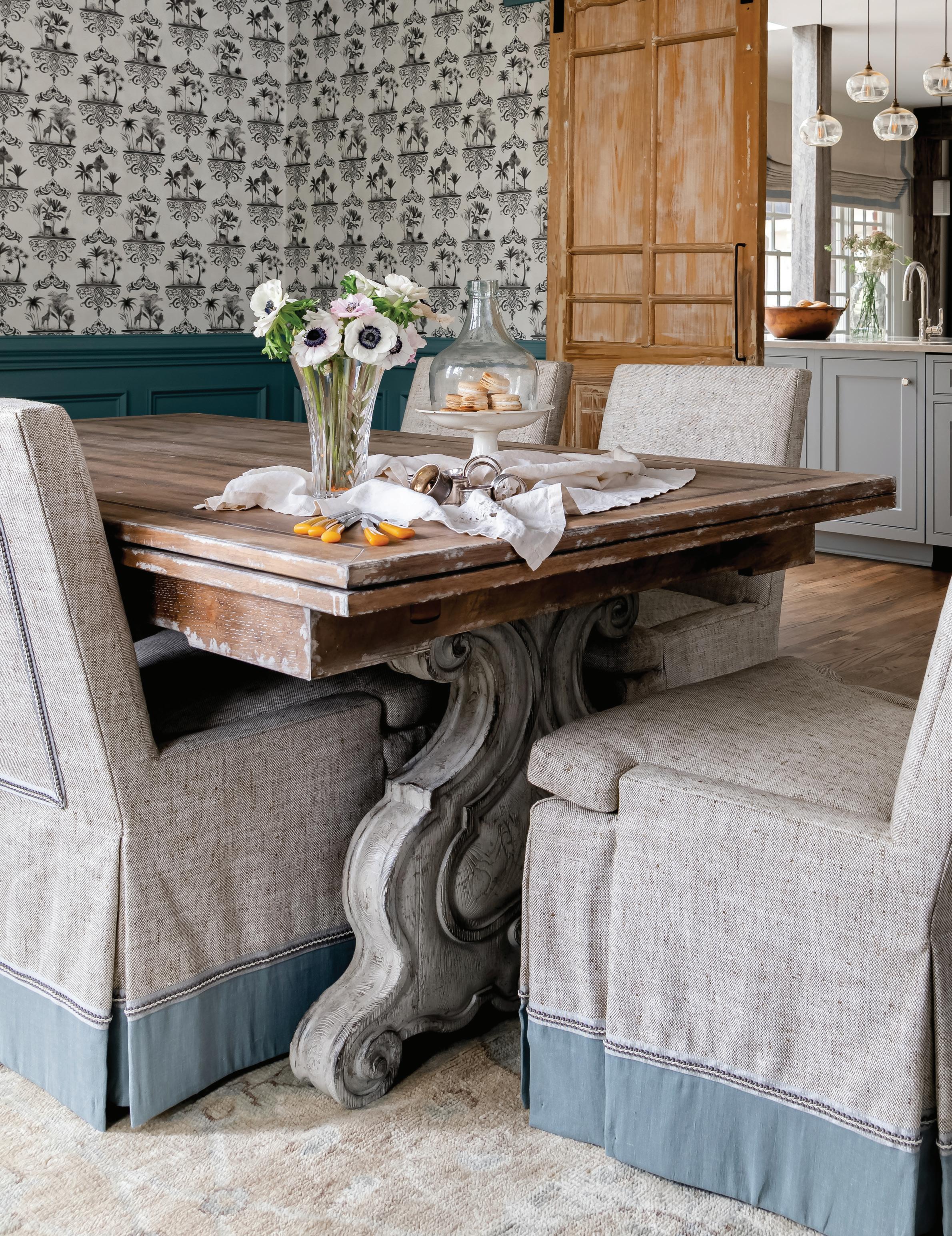 ON LEFT: This dining room, with its classic wallpaper and dusty blue accents, offers a seamless transition into the adjacent kitchen, creating a cohesive space that is both graceful and inviting. The traditional wallpaper, featuring a botanical print, compliments the French country aesthetic, while the blue-painted trim and matching drapery frame the room with a pop of color that echoes the kitchen's cabinetry. The well-curated mix of rustic wooden furniture and refined, upholstered chairs with blue detailing further bridges the aesthetics of warmth and sophistication, harmonizing the Old World charm with contemporary touches.