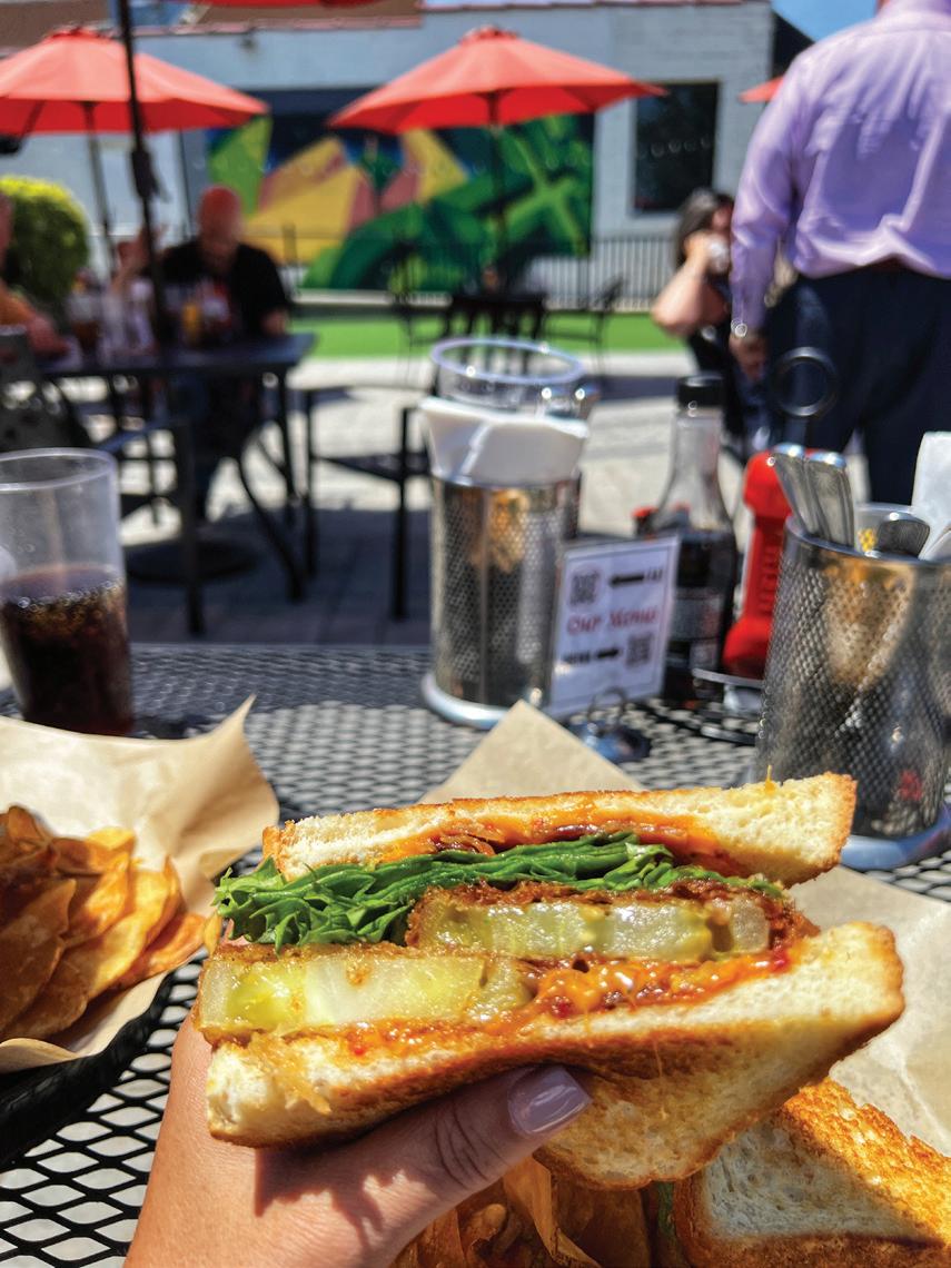 A fried green tomato sandwich on the expansive patio of Crosstown Pub & Grill in Cary makes for the perfect summertime lunch.