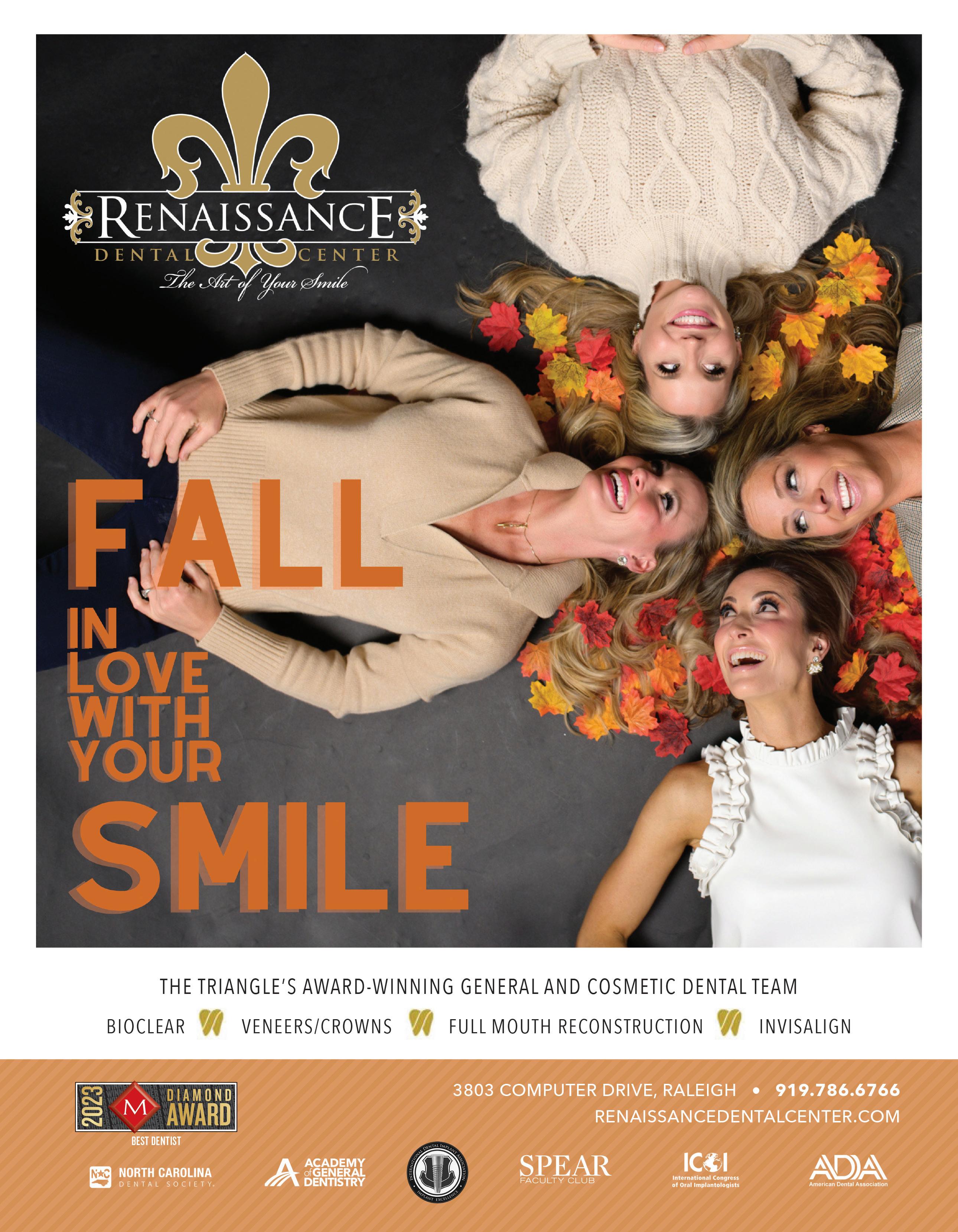 The arrival of fall brings a variety of events and attractions to the area. From pumpkin patches to Halloween festivities, discover 48 ways to enjoy the season on page 54. And if your favorite couple becomes engaged during this beautiful time of year, familiarize yourself with the concept of microweddings on page 60 to find out why this format has become so popular with today’s brides and grooms. If you have an aspiring collegiate athlete, be sure to read the advice from former D1 athletes on page 64. Meet another former D1 player on page 96: UNC–Chapel Hill Field Hockey Coach Erin Matson, the youngest collegiate coach in the country.