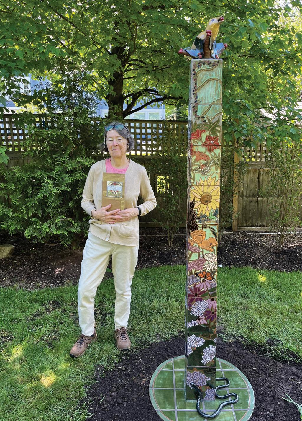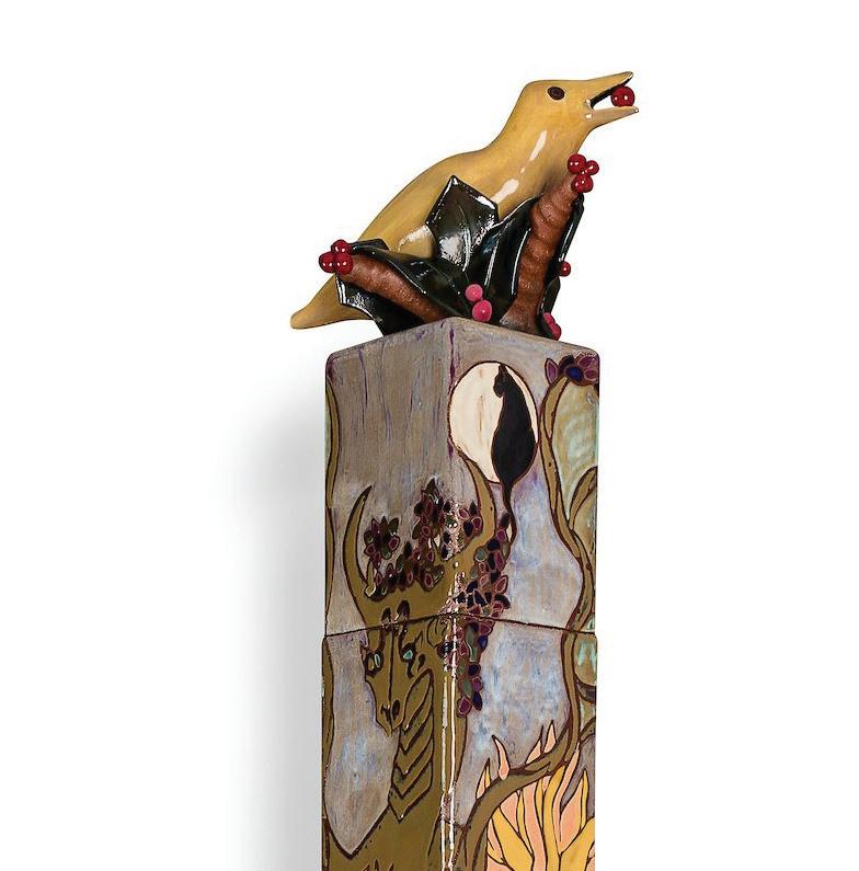 Bosetti creates custom tile pieces inspired by the client and his or her home, such as her recent tile sculpture, “Garden Fantasy,” which was installed in the garden of a New Jersey home; the client commissioned Bosetti to create it for her daughter as a thank-you gift for allowing her to move into a new suite in her home. Bosetti, who always incorporates personalized elements into commissioned work, added geraniums and other floral features from the client’s garden, along with a bird at the top of the sculpture to represent the client’s grandchildren, who will one day take flight. The sculpture consists of nine interlocking sections that are stacked so that the sculpture is not permanent. One day, this sculpture can be taken apart to move with the family.