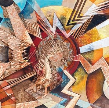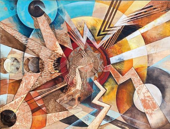 ACRYLICS, INKS, CARVING, WOODBURNING ON CRADLED BOARD, 30 " X 40 "