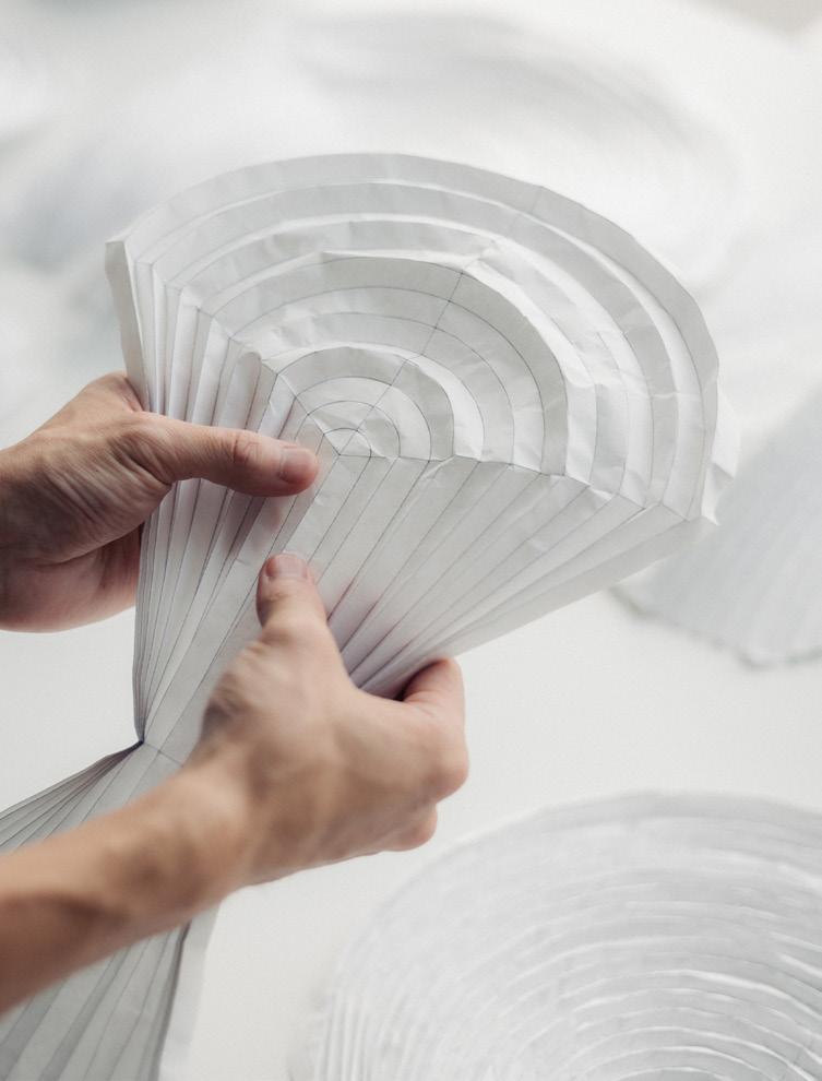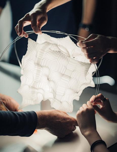 structurel : nous créons des vêtements, mais nous aimons laisser les gens choisir la façon dont ils les portent, en fonction de leur mode de vie, explique Yoshiyuki Miyamae. C’est la même idée pour ce projet : les lampes portables peuvent être emportées, déplacées ; les suspensions sont modulables et peuvent aussi faire office d’œuvres d’art. Issey Miyake a toujours clamé l’importance du design dans la vie quotidienne, et pensé que les créations doivent avant tout être une réponse au mode de vie des gens. C’est pour cela que nous avons décidé de nous impliquer davantage dans la conception d’objets. Il y a d’ailleurs des similarités dans les processus de conception et, de la même façon, nous avons à cœur de travailler avec des personnes et des entreprises spécialisées issues d’autres industries pour étendre encore davantage nos champs d’action et nos projets, ce qui est très excitant. Nous sommes bien plus qu’une maison de mode ». —