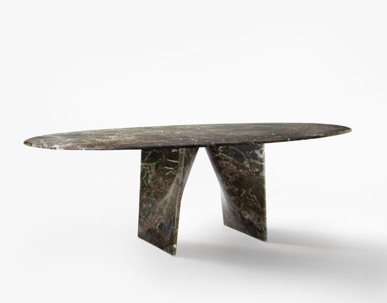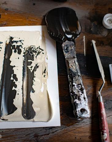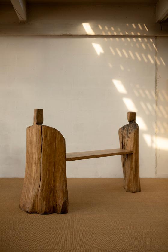 tale, essentiellement au coin et à la masse, avant de les redresser pour le peaufinage. « Nous les brossons longuement pour que la matière devienne tactile, sensuelle », explique l’artiste. « J’aime les traces noires que laissent les outils sur le col de ces personnages, comme un ajout au fusain », confie Julien Régnier. Les quelques pièces uniques – deux consoles de dimensions différentes et une table – ont été présentées sur le stand de Maisonjaune Studio lors de la récente édition du PAD parisien. Et un siège ? « Il me faut encore un peu de temps pour y réfléchir, sourit le sculpteur. Le fait qu’il supporte le poids de l’homme le rend par nature complexe. » La collaboration a vocation à se poursuivre dans le temps. De quoi laisser aux grands gardiens de bois tout le loisir d’observer leur nouvel usage. —