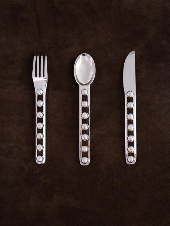 La designer Jessi Burch se distinguait jusqu’ici pour son travail de l’argent dont naissaient des bijoux sculpturaux. Une visite à la Neue Galerie, un musée new-yorkais mettant en lumière l’art autrichien et allemand du xxe siècle, et notamment le mobilier de Josef Hoffmann, lui a donné l’idée de s’aventurer dans la sphère domestique. Elle s’est inspirée de sa SevenBall Chair en bois courbé, conçue en 1908, à Vienne, pour créer des couverts en laiton laqués d’argent. Ainsi, avec ses pièces faites main, elle élève l’art de la table moderne. Les lignes organiques de ce set, composé d’une fourchette, d’un couteau et d’une cuillère, les rendent d’autant plus irrésistibles. L’envie de les exposer, comme les œuvres du designer autrichien dans les vitrines du musée new-yorkais, ne manquera pas d’émerger dès que ces merveilles seront en vue. (M.F.)