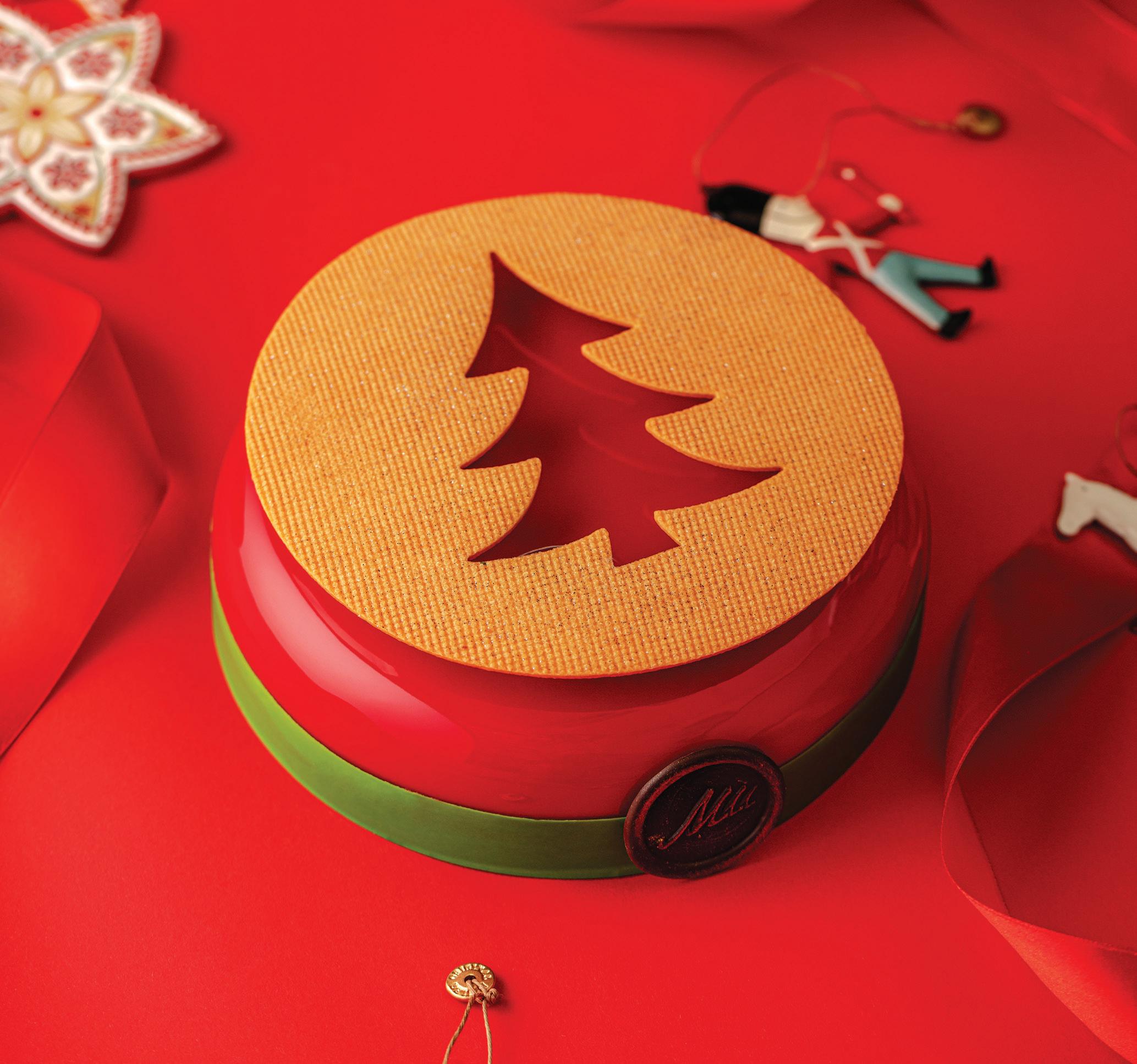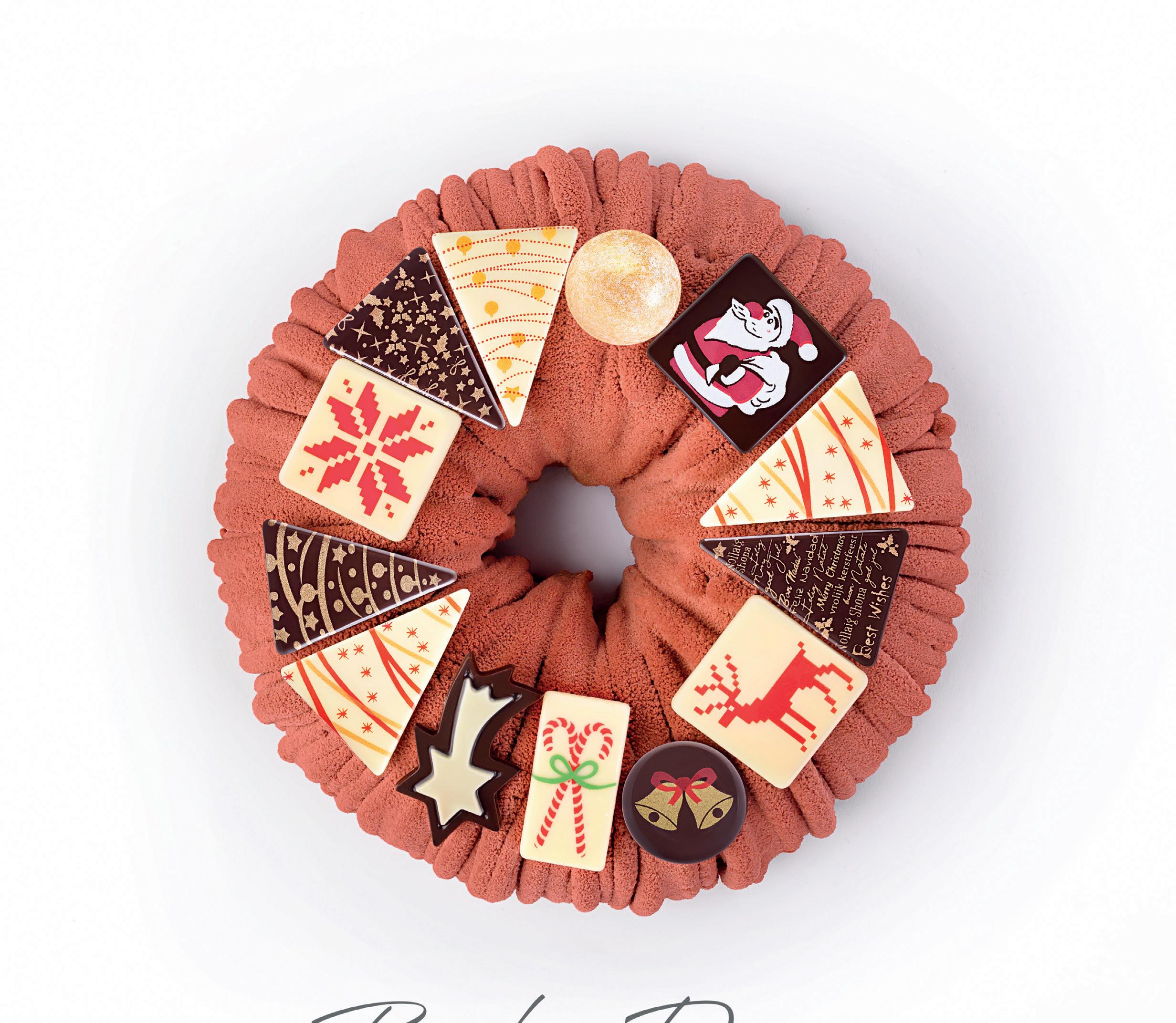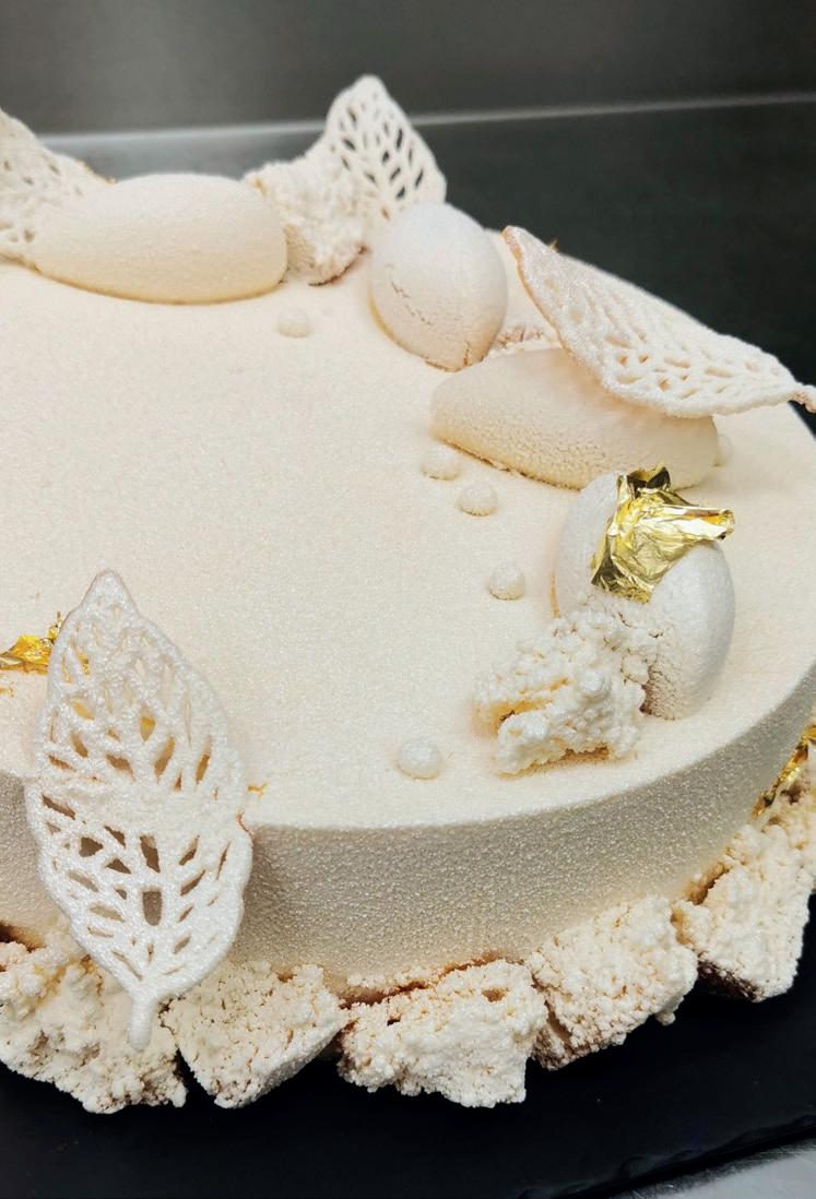 Mix florentynkowy wsypać do forem silikonowych i wypiekać na chrupko. Kształtować, gdy są jeszcze ciepłe. Na torcie ułożyć dekoracje według uznania, włącznie z listkami, i jeszcze na kilka minut włożyć do zamrażarki. Wyciągnąć i zamszować w całości pistoletem natryskowym.