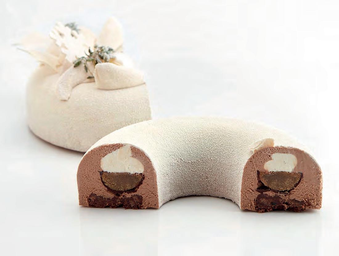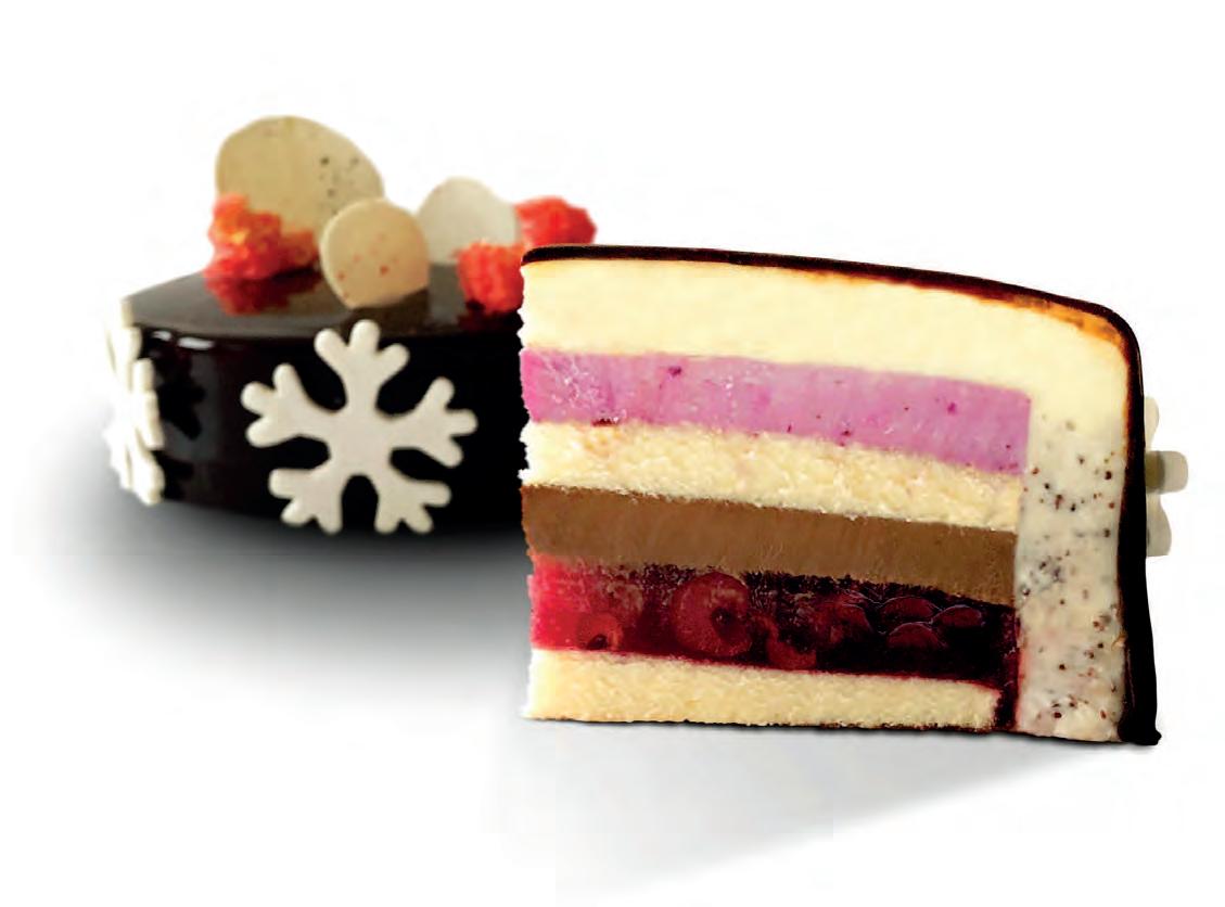 Wszystkie składniki wymieszać na wolnych obrotach przez ok. 4 min (z użyciem płaskiego mieszadła). Masę dozować (ok. 100 g/szt.) przy użyciu rękawa cukierniczego do form silikonowych Silikomart (SQ029 o średnicy ok. 12 cm i głębokości ok. 2 cm).