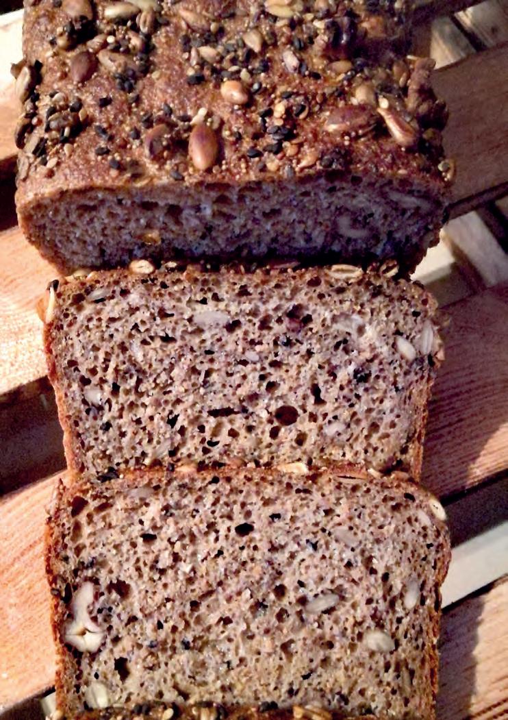 1. Ciasto 275 g ziarna pszenicy okrągłoziarnowej 60 g ziarna samopszy 60 g ziarna płaskurki 300 g wody 120 g zakwasu żytniego razowego z krzycy 11 g soli 12 g miodu 5 g oleju 100 g nasion (30 g słonecznika, 30 g pestek dyni, 40 g miksu: czarny i biały sezam, amarantus, quinoa) 40 g orzechów włoskich