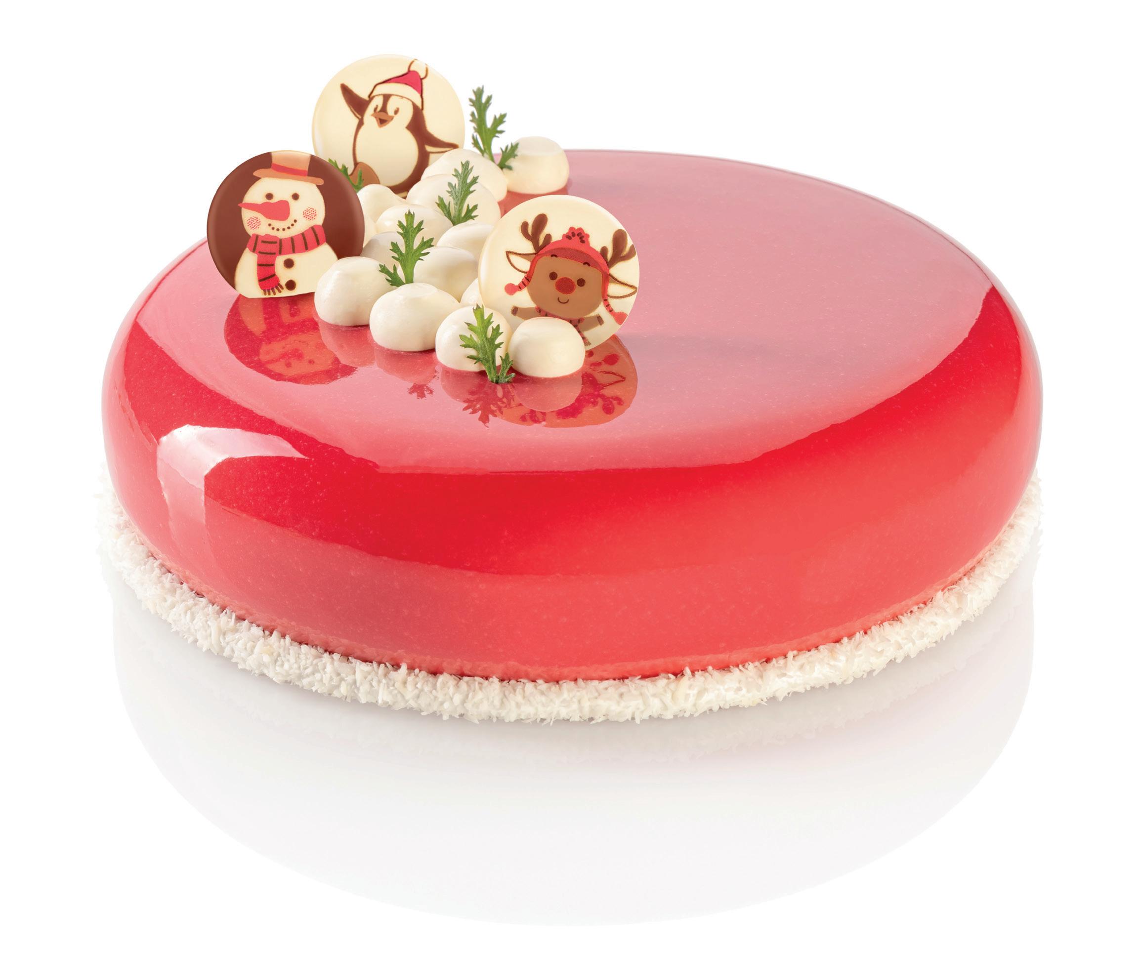 Namoczyć żelatynę w wodzie (2). Z cukru, wody (1) i glukozy ugotować syrop o temperaturze 103°C. Dodać białą czekoladę, mleko skondensowane i namoczoną żelatynę. Wymieszać blenderem. Na końcu dodać barwnik. Zamrożone torty oblać polewą nabłyszczającą o temp. ok. 30°C.