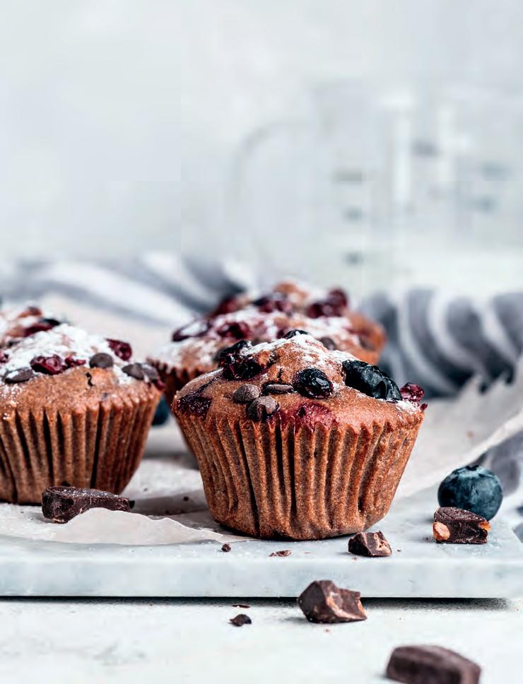 Ciasto 950 g Kruszwica Muffin 360 g olej Maestro świeżość 320 g wody 200 g jogurtu typu greckiego 50 g kakao ekstra ciemnego 100 g borówki amerykańskiej 100 g dropsów czekoladowych