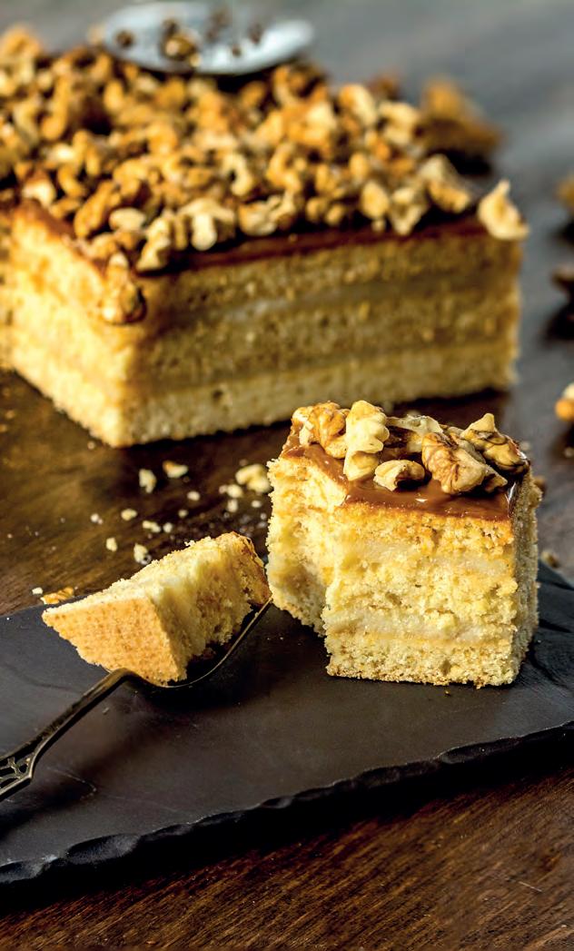 Białka oddzielić od żółtek. Masło utrzeć na puszystą masę razem z cukrem pudrem i aromatem waniliowym, następnie dodawać po 1 żółtku. Mąkę pszenną przesiać z mąką ziemniaczaną do jednej miski i dodawać do masy po łyżce. Białka z dodatkiem soli ubić na sztywną pianę, stopniowo dodawać cukier. Ubite białka dodać do masy i delikatnie wymieszać. Smarować warstwami na macie, opiekać powoli pod opiekaczem.