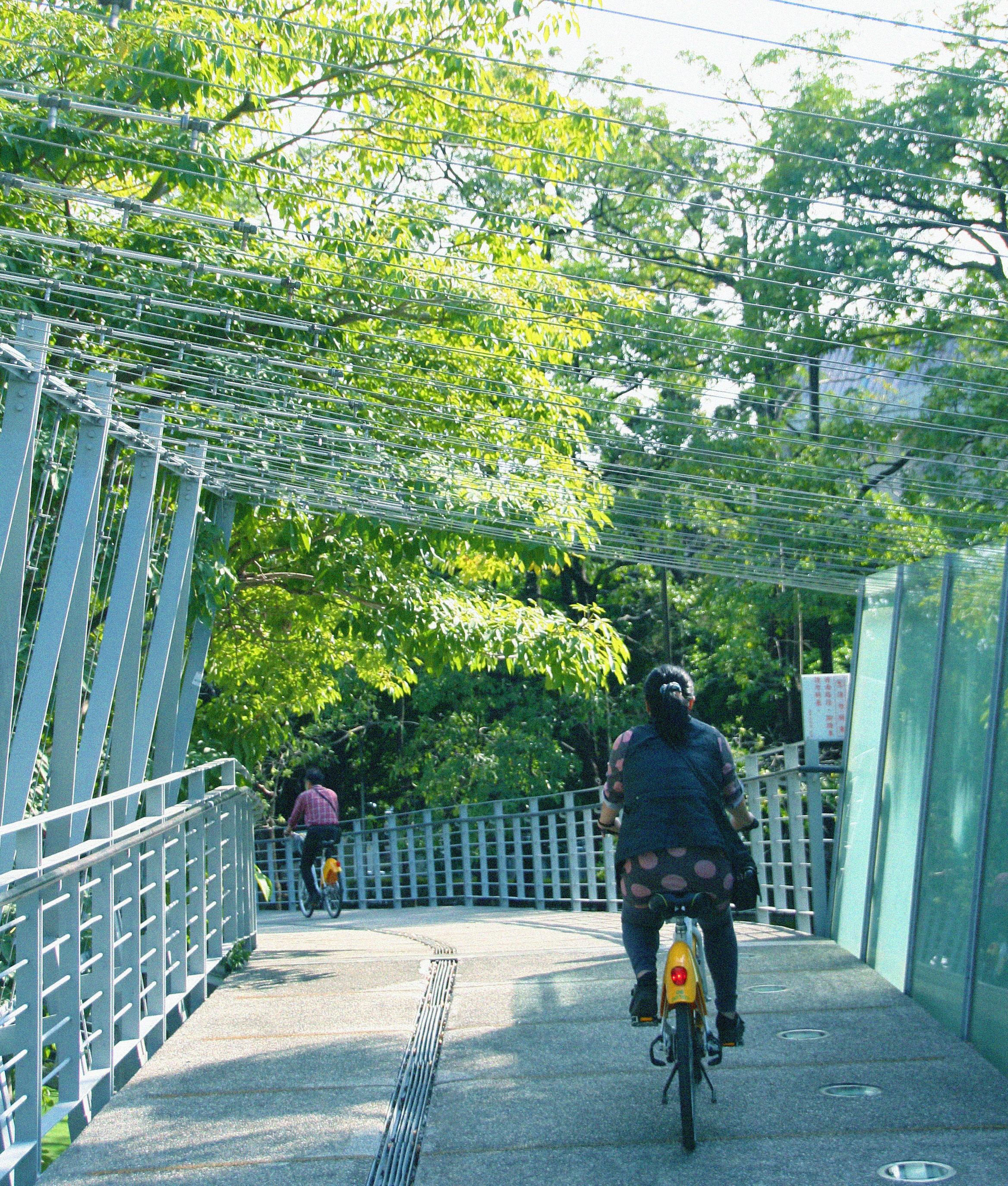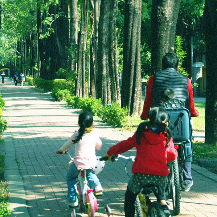 區內設有歷史廣場、文學步道、動物石雕、拱 型花廊、花纖吊橋及遍植花木,全長約1.6公里 的環狀自行車道,環繞公園,尤其入夜後庭園燈飾 綻放,溪水燈火搖曳,是散步的好去處。