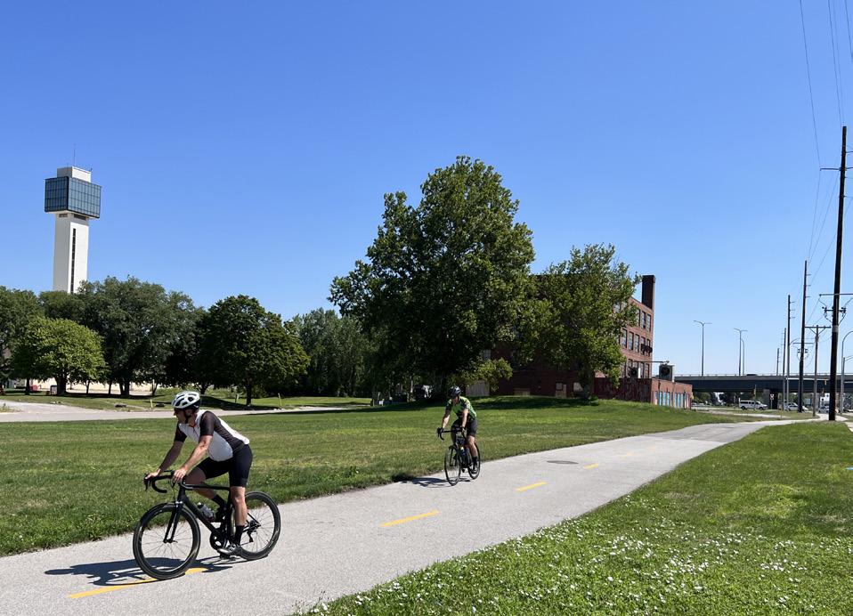 The I-74 Corridor is reimagined as a green gateway and connector complete with parks, public spaces, and trails running along its length.