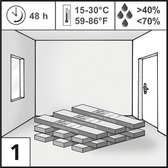 La aclimatación del producto es necesaria y debe efectuarse en los recintos a instalar, estos deben estar cubiertos y cerrados con sus puertas y ventanas debidamente instaladas durante un periodo de 48 horas previo a la instalación, idealmente a una temperatura entre 18°C y 30°C y una humedad relativa de 40% a 70%.