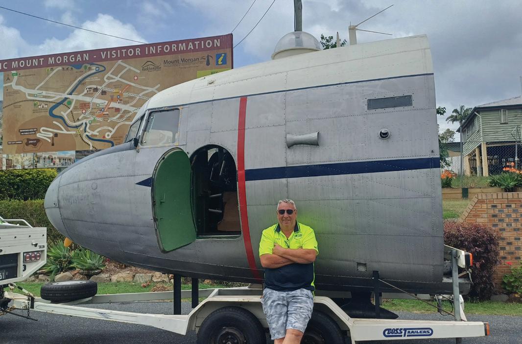 Mount Morgan played host to a significant piece of World War II history when private collector David McLean stopped at the Mount Morgan Visitor Information Centre and Driver Reviver stop to break his journey.. David (pictured below with the restored cockpit) was on his way back to Far North Queensland, transporting the fully restored cockpit of a 1944 C-47 Douglas Dakota aircraft, service number A65-111.