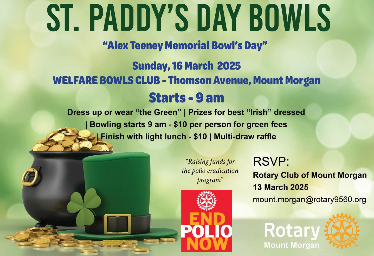 MAR 16: St Patrick’s Day Bowls - Welfare Bowls Club, Thomson Avenue - starts 9 am. RSVP
