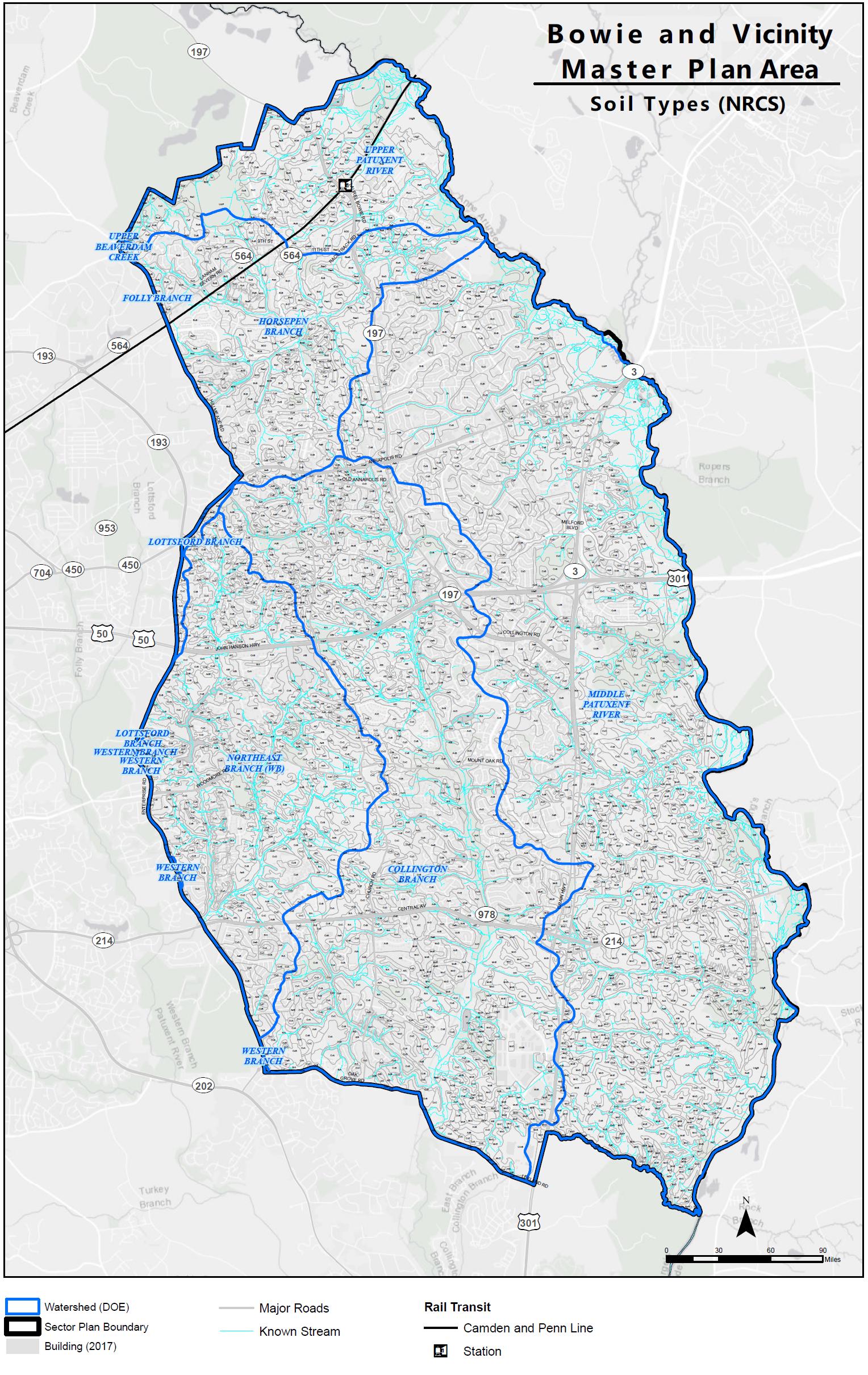 The predominant soil series in the master plan area is the Collington series, covering about 35 percent of the area. These soils are categorized as being deep, moderately well-drained soils with fine to moderately coarse textures. The description of this series indicates a potential for moderate to high runoff when saturated. Zekiah, Widewater, and Issue soils occur individually, or in combination, along the master plan area’s streams and in areas that are frequently flooded, while Adelphi, Annapolis, and Sassafras soils are generally prevalent on steeper slopes. Christiana soils are associated with Marlboro clays in most of the central and southern portions of the master plan area. For that reason, soil investigations should be conducted to find the best methods of constructing building foundations. Soil studies will also be needed when planning and locating stormwater management facilities to ensure that they are found on sites where stormwater infiltrates easily. Detailed soils investigations will be needed before preparing specific development applications.