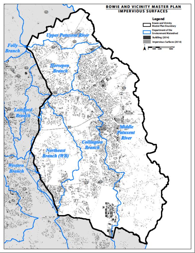 Table 8 shows that portions of the Middle Patuxent River and Collington Branch watersheds that are within the master plan area have high imperviousness at 7.27 percent and 6.48 percent, respectively, consistent with the Poor and Very Poor watershed quality ratings in the two watersheds.