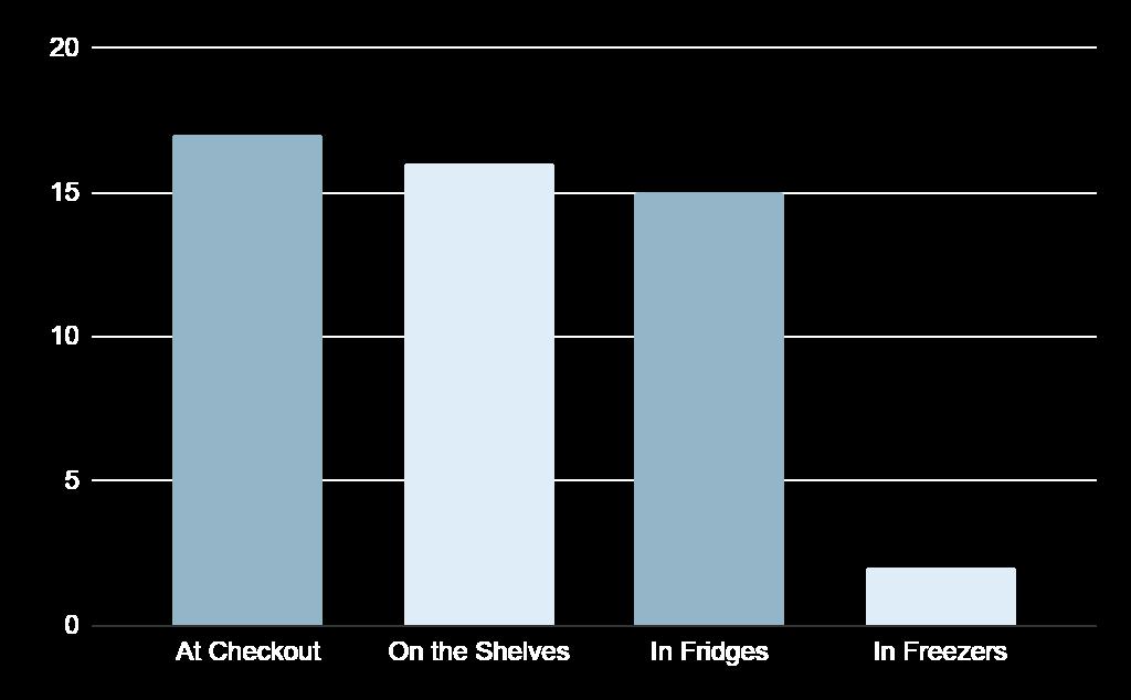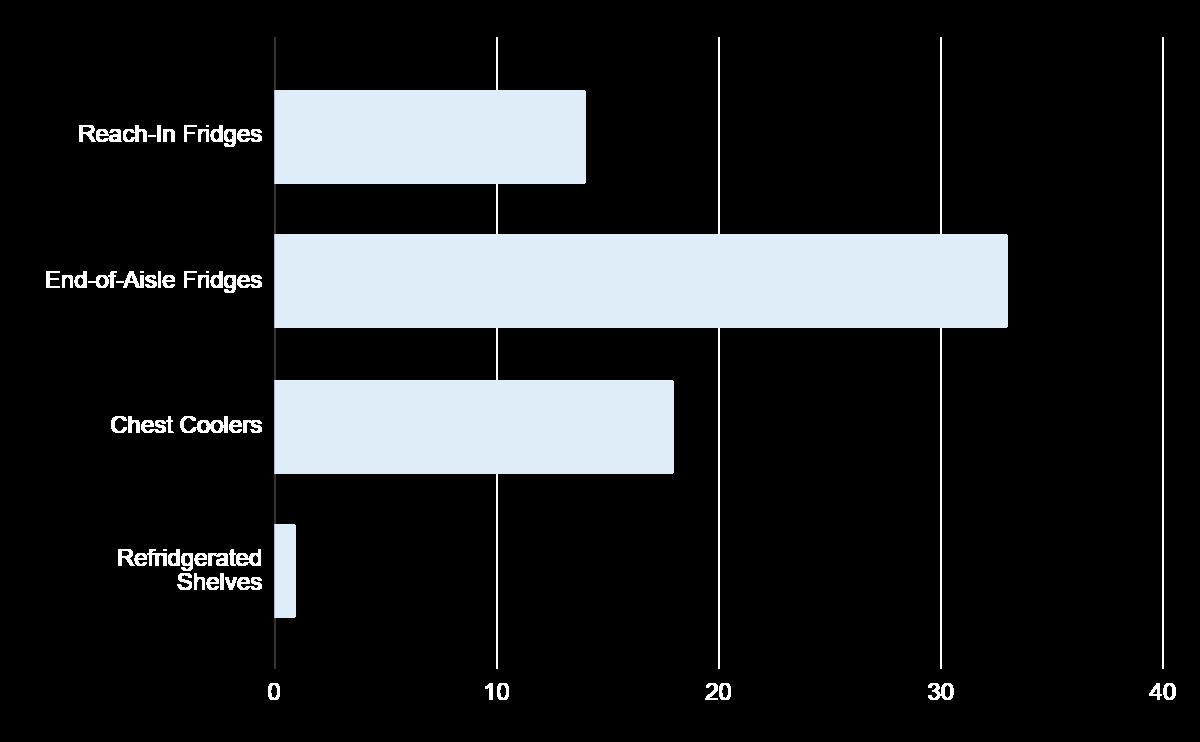 ■ End-of-aisle and reach-in fridges were the most common form of refrigeration and refrigerated shelves were least common